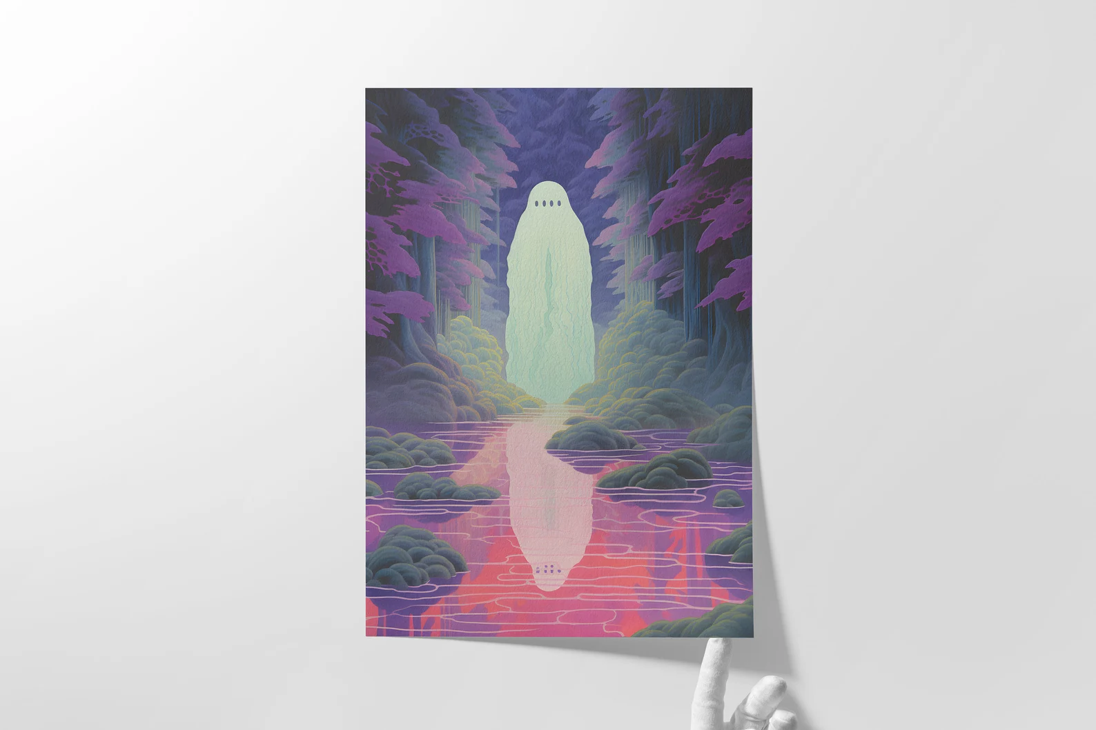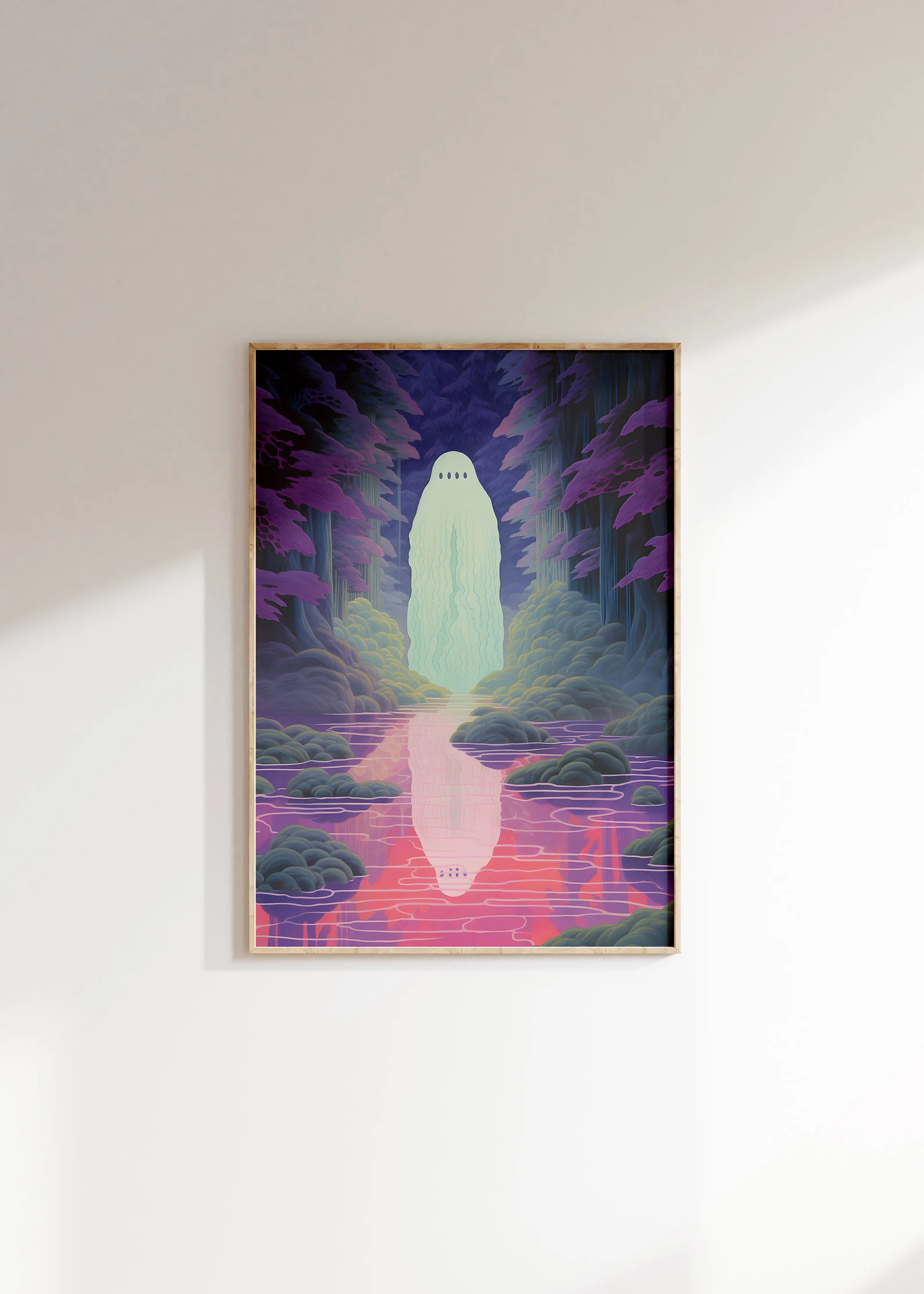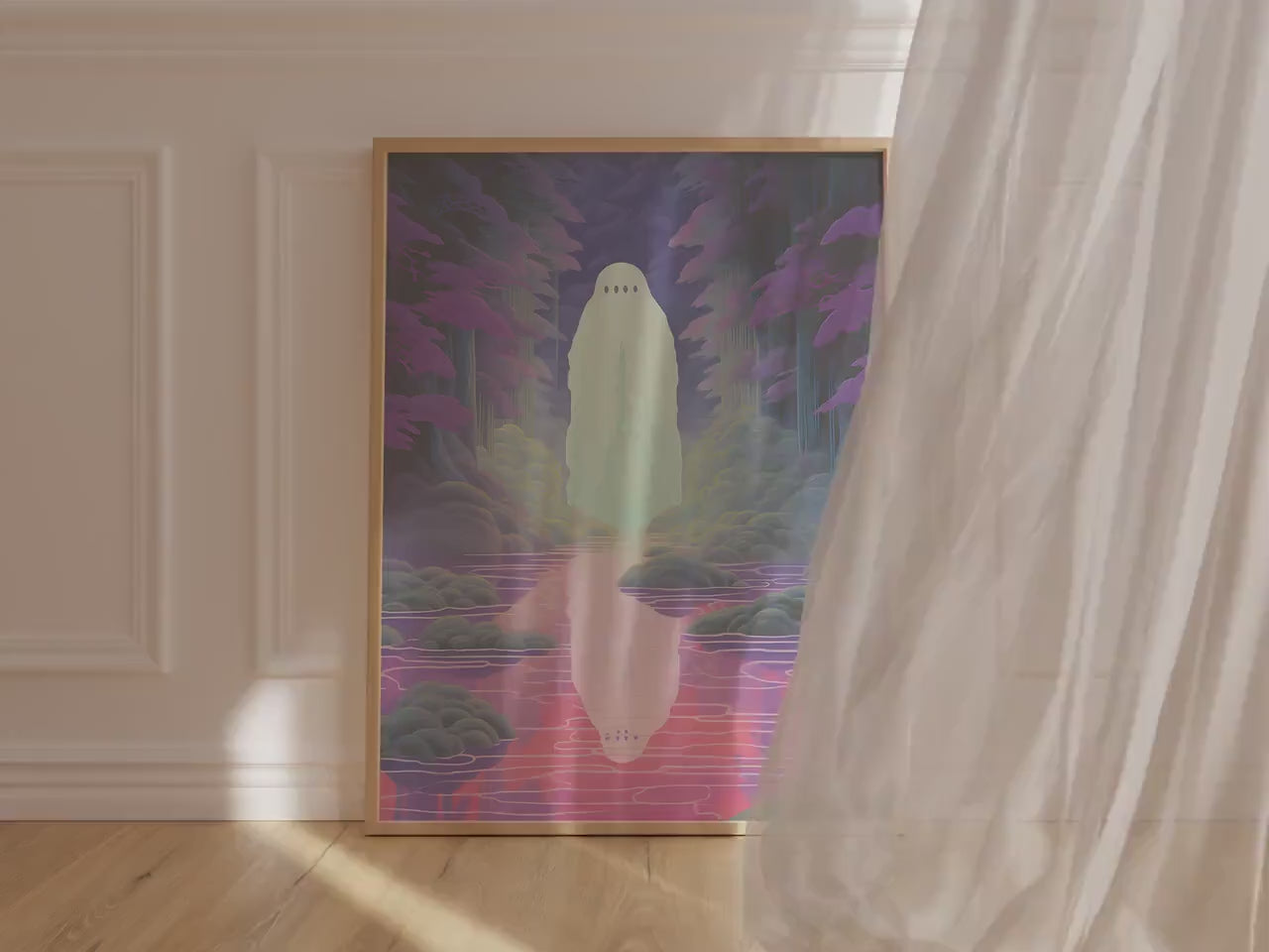 If you’ve ever wanted your wall to whisper ghost stories, Boo is the one. This surreal landscape features a glowing spirit hovering in a dreamy, violet-hued forest, casting a perfectly spooky reflection in its rippling stream. It's the kind of art that makes you lean in closer. Ethereal, slightly weird, and weirdly soothing, this one is for the dreamers, the wanderers, and the ones who keep their lights on at night (just in case).