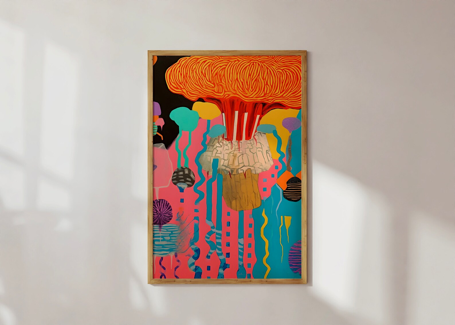 Somewhere between a jellyfish rave and the world’s most stylish meltdown lives “Candy Apocalypse.” This piece explodes with high-voltage energy, lava-like oranges, brainy squiggles, and drippy textures that buzz right through the frame. It’s bold. It’s bizarre. It’s the art equivalent of popping six lollipops and then reading Nietzsche. Abstract, psychedelic, and just the right amount of deranged, this one doesn’t whisper. It shouts, in glitter.