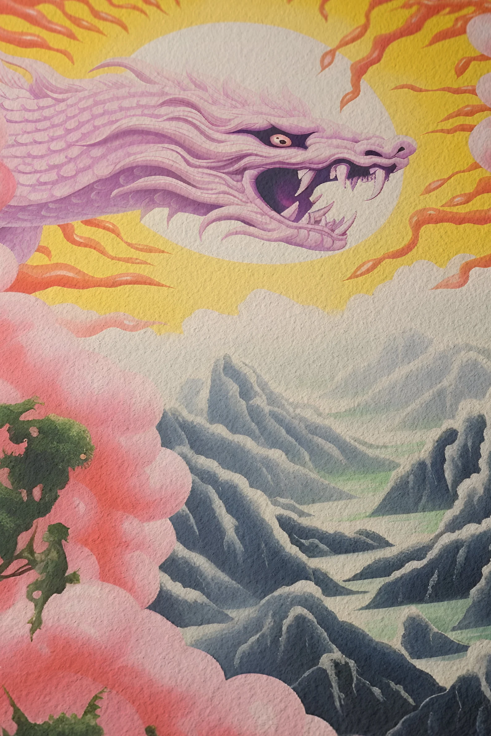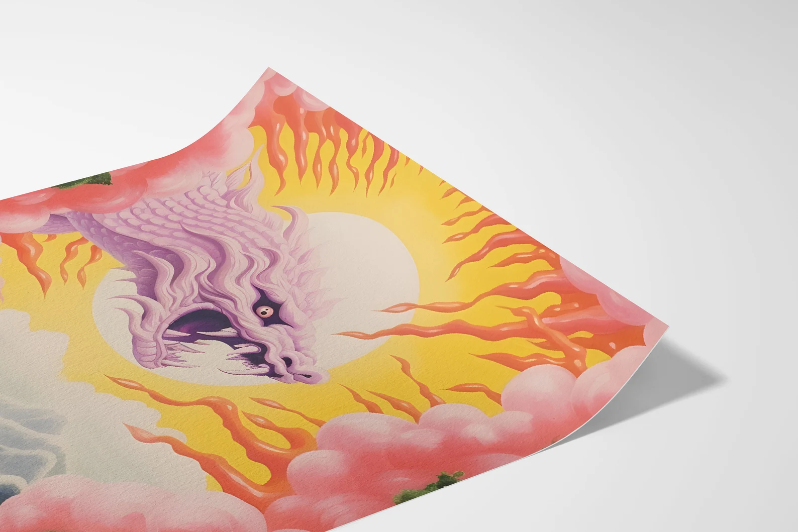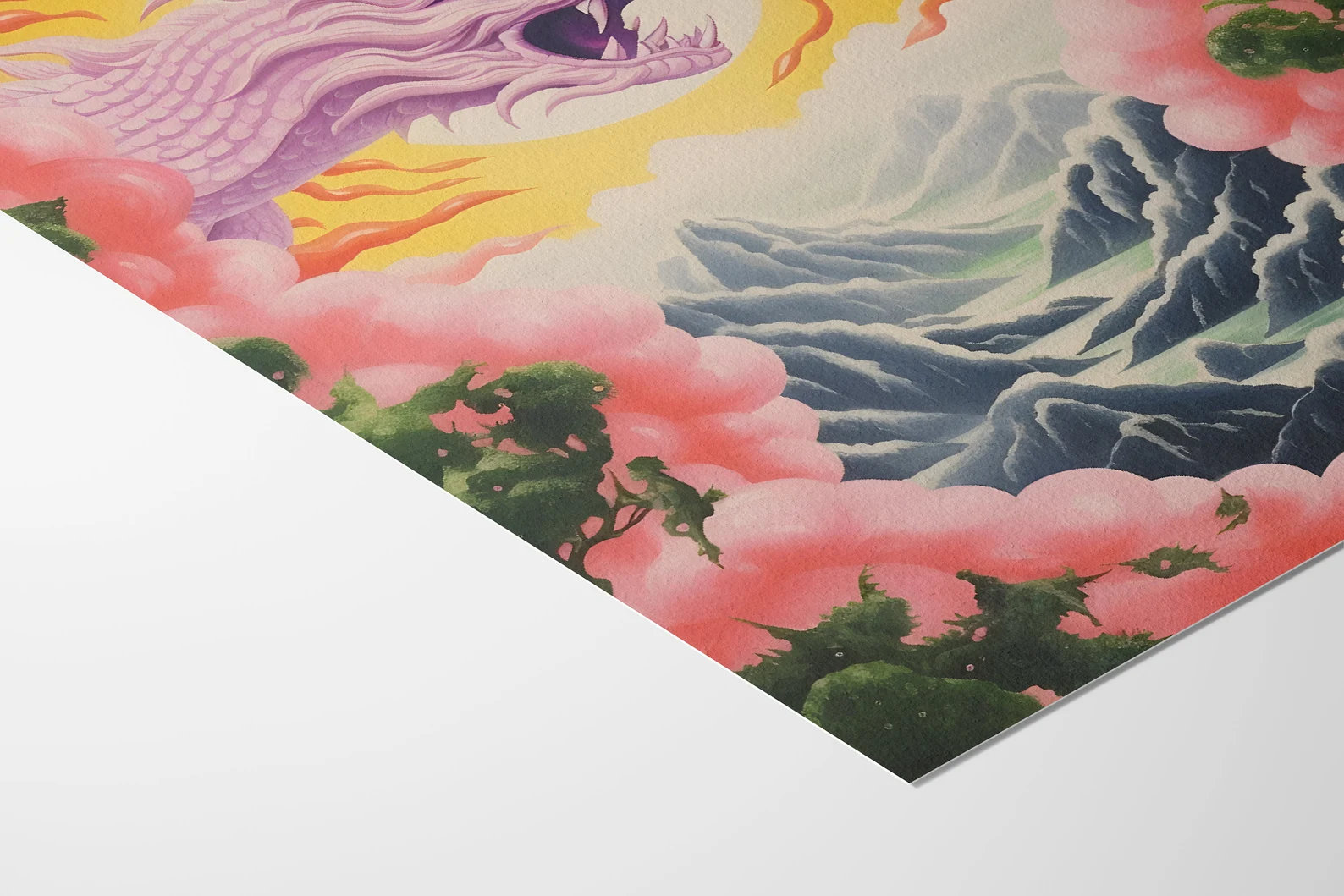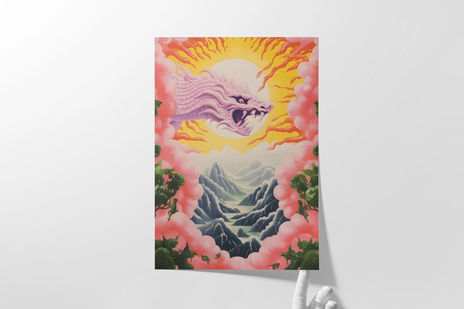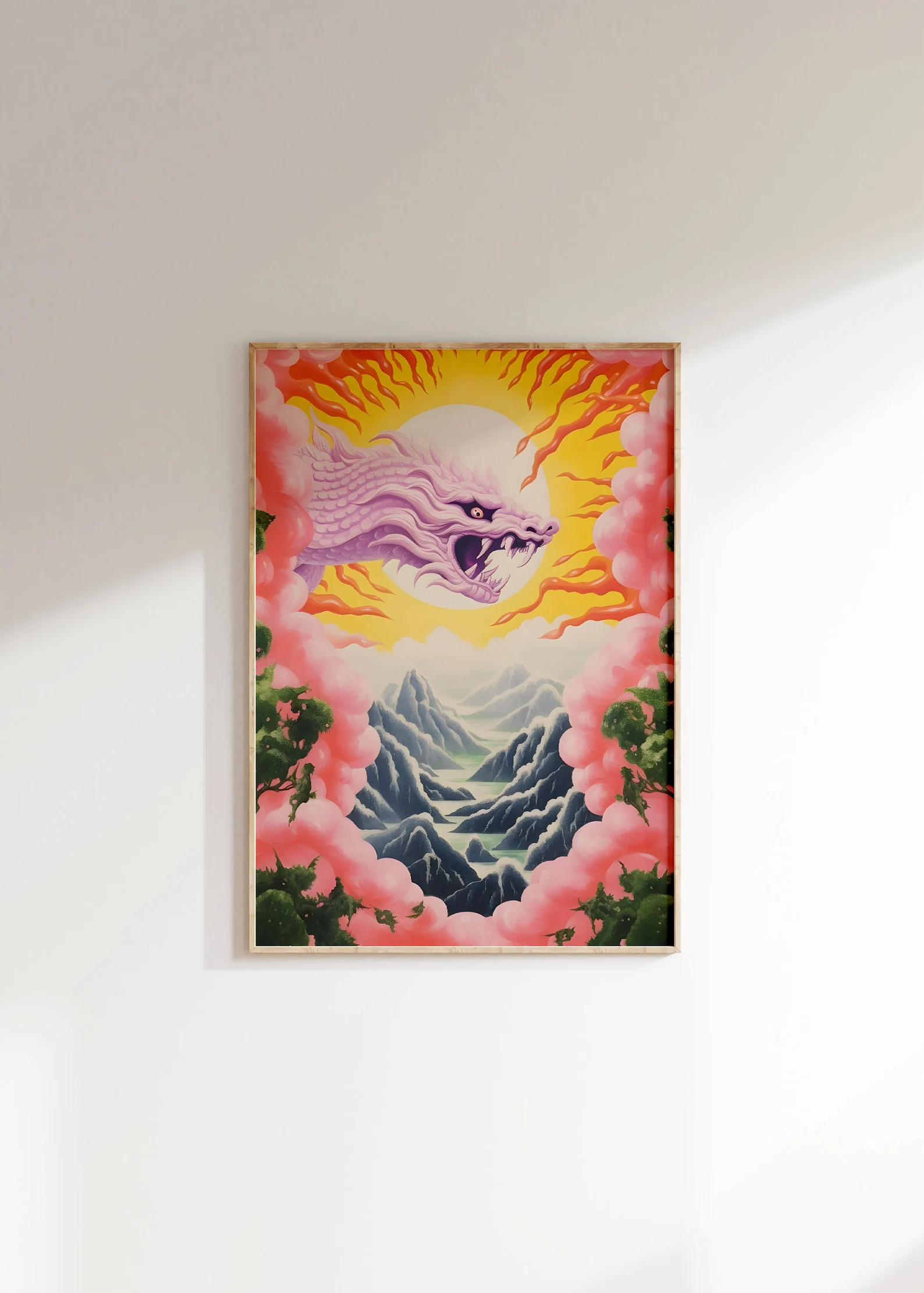 Dragonlight Valley isn’t just a landscape; it’s a portal. A lavender-hued dragon explodes from a radiant sun like it owns the place (because it probably does), illuminating a dreamlike terrain of jagged peaks and misty valleys. Candy-pink clouds frame the scene like a fever dream, and lush greens anchor it back to earth. There’s tension, there’s peace, there’s chaos with a halo. This print brings full fantasy energy, the kind that makes you pause mid-scroll and go, “Wait… what is this?” Exactly.