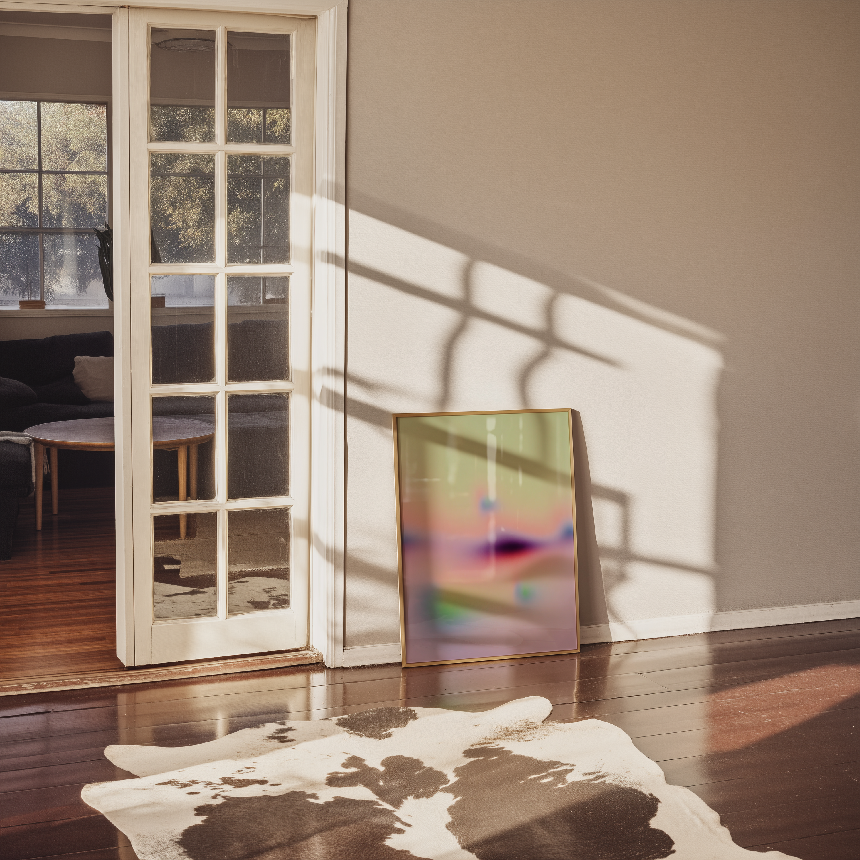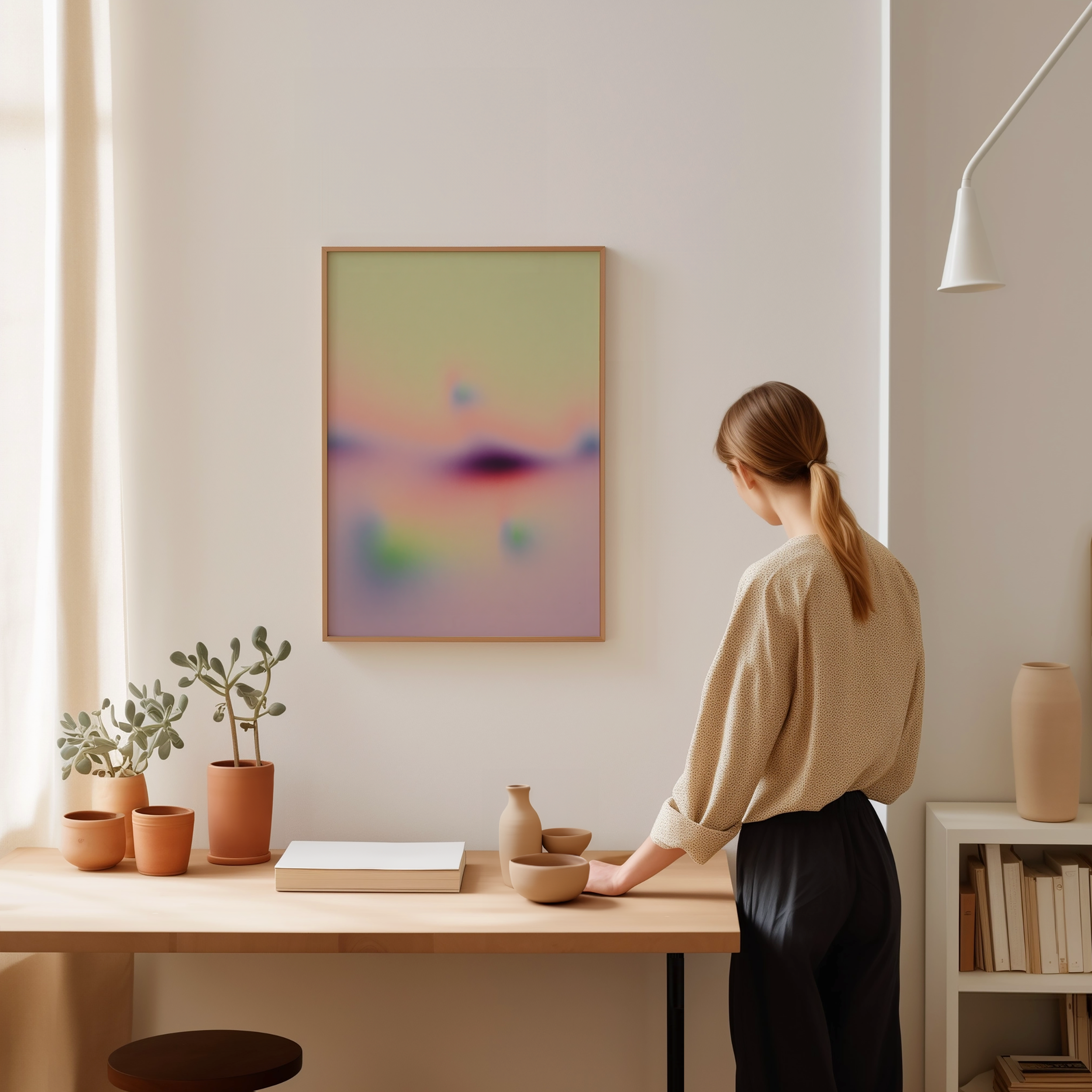 Blushing gradients in coral, lavender, and green drift across a pale horizon, like the echo of a bloom caught in memory. This minimalist abstract wall art is designed to create a feeling — of pause, of openness, of breath.