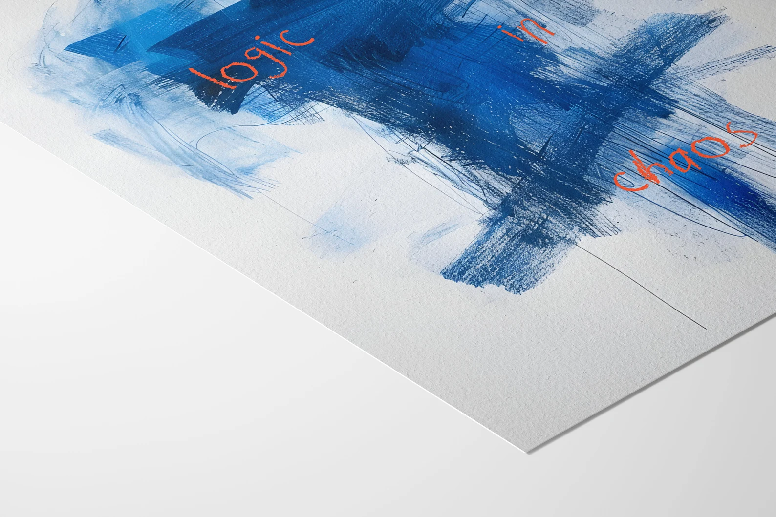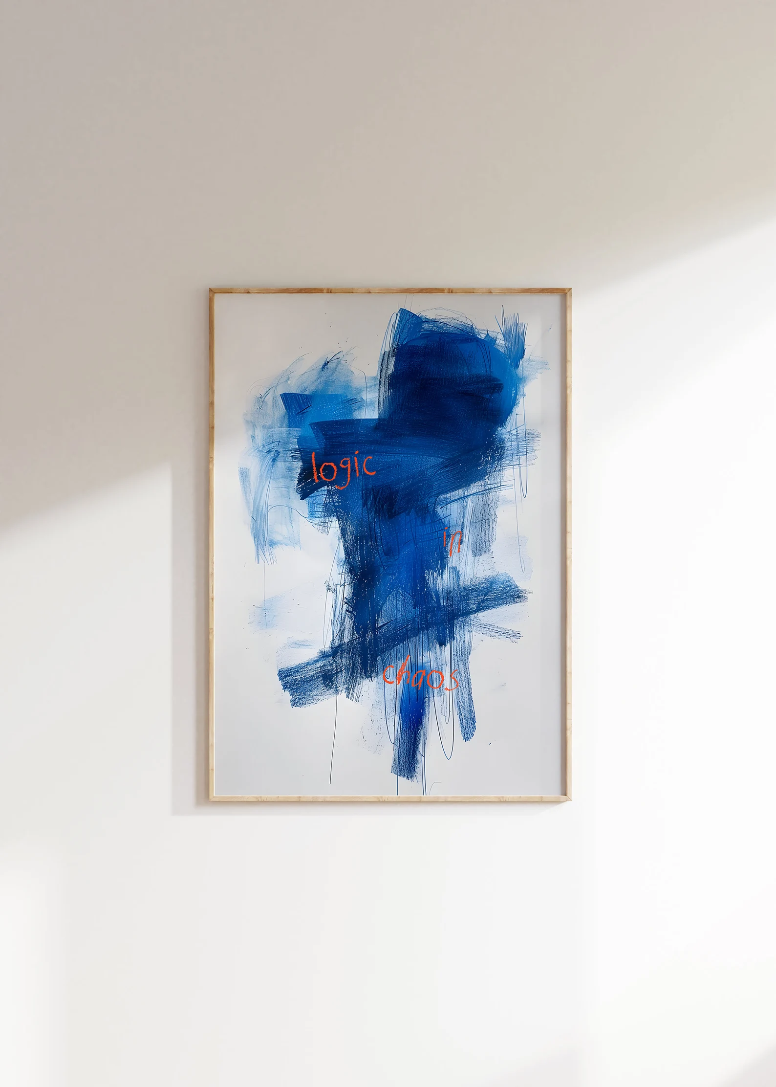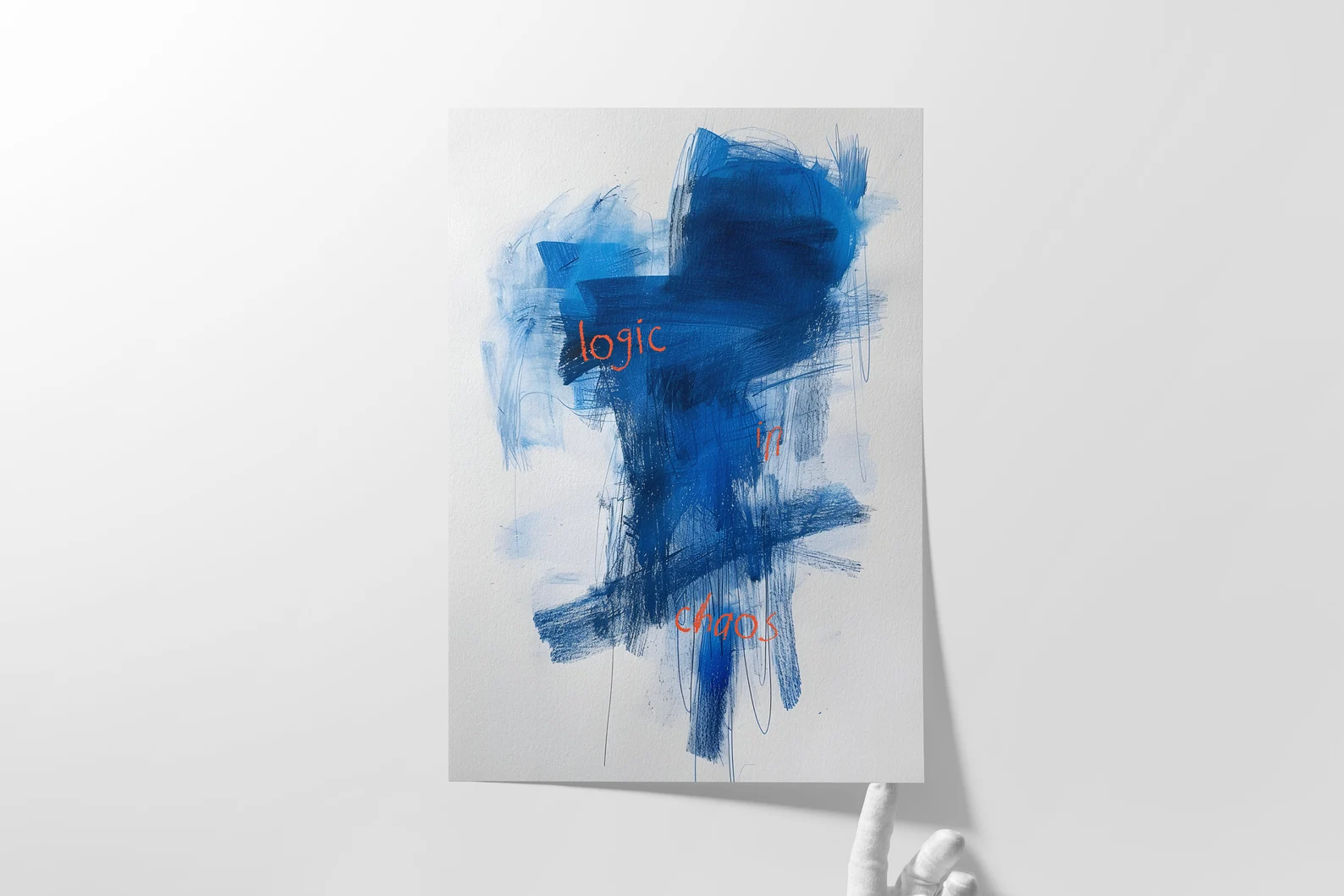 Logic in Chaos is part abstract expression, part spiritual epiphany. Slashes of bold blue scrawl across a clean white space like ideas mid-meltdown, but look closer and you’ll spot the message hiding inside: clarity, in the mess. This is the visual equivalent of journaling at 3am, or finally understanding your own brain. Wild, raw, and a little bit genius.