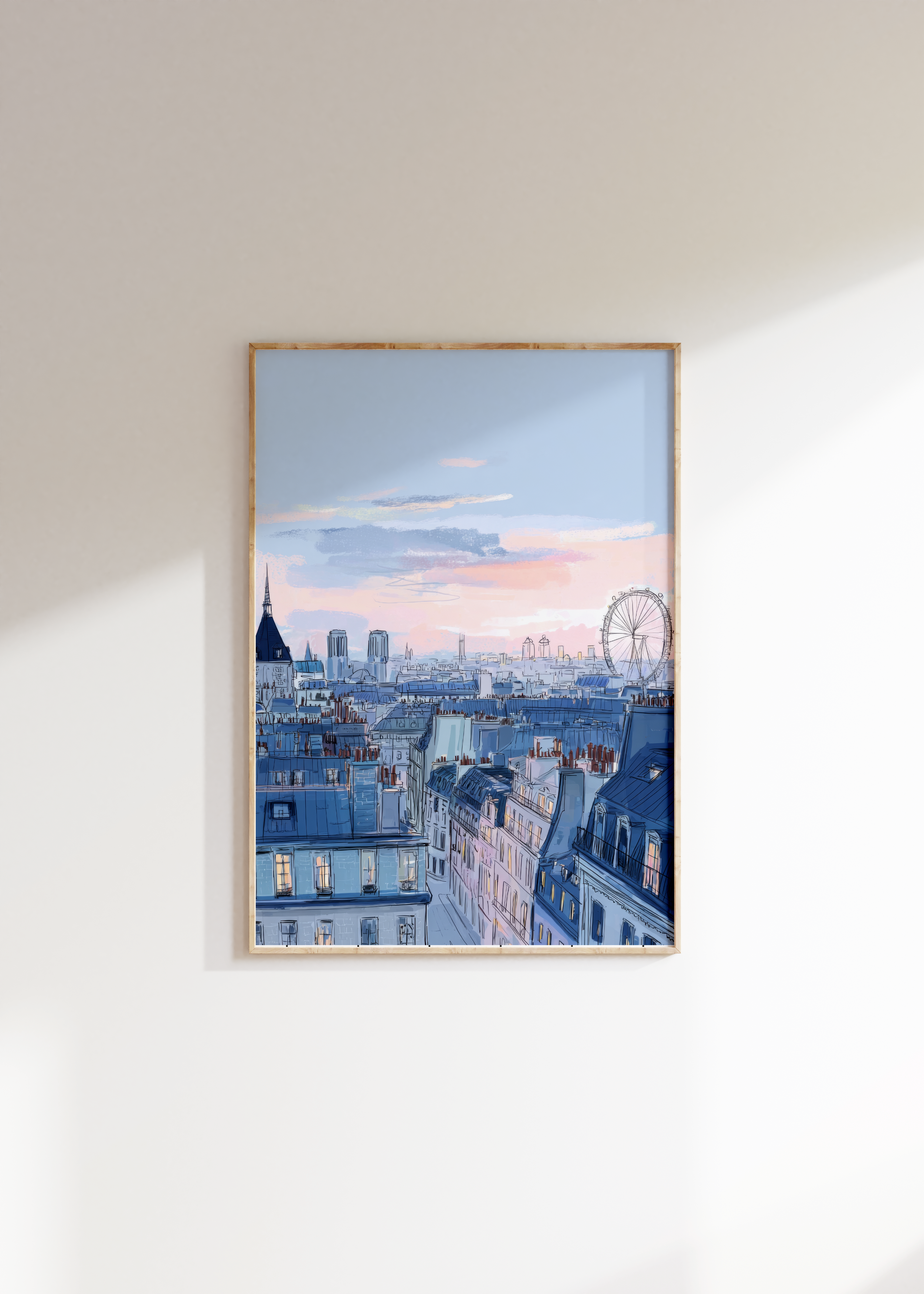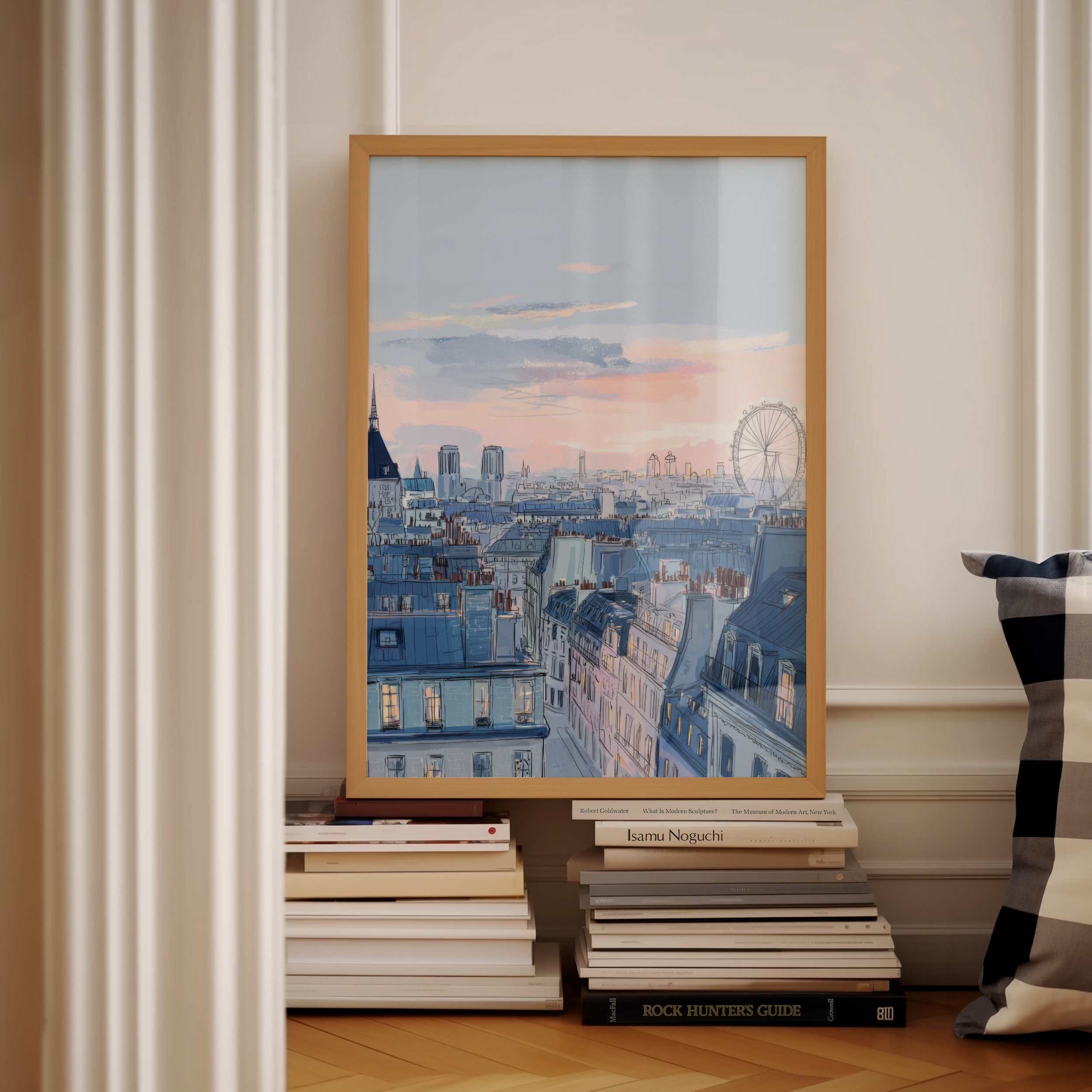 London at Dusk is a love letter to rooftops, quiet skies, and the in-between hour when the city breathes differently. With soft pastel clouds melting into the skyline and windows flickering to life, this piece captures the feeling of watching it all from above — still, cinematic, and full of story.