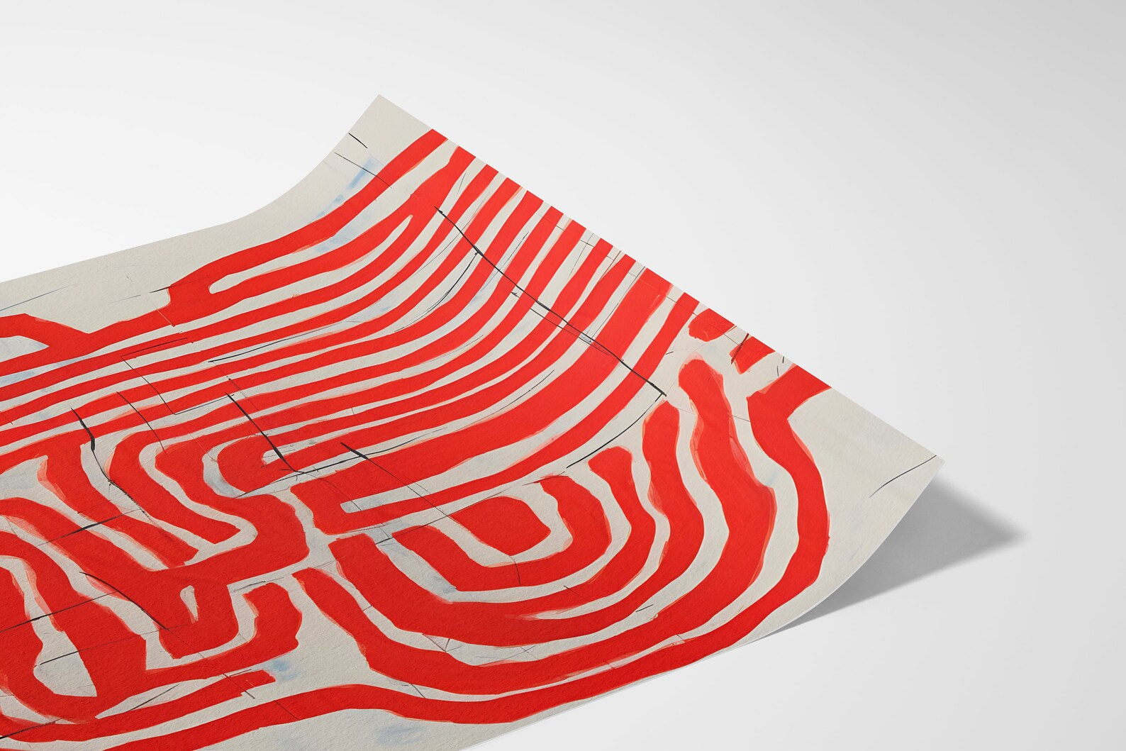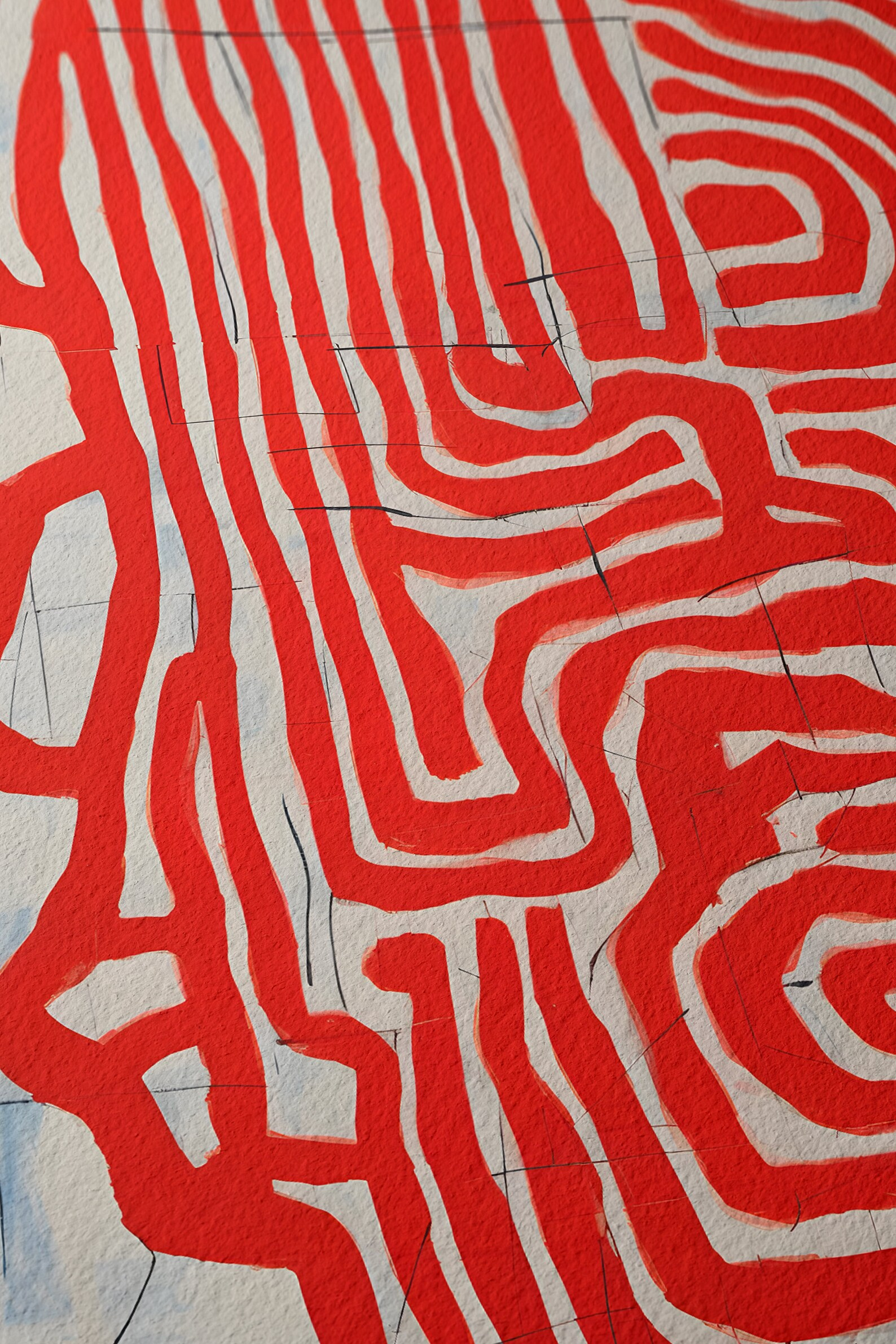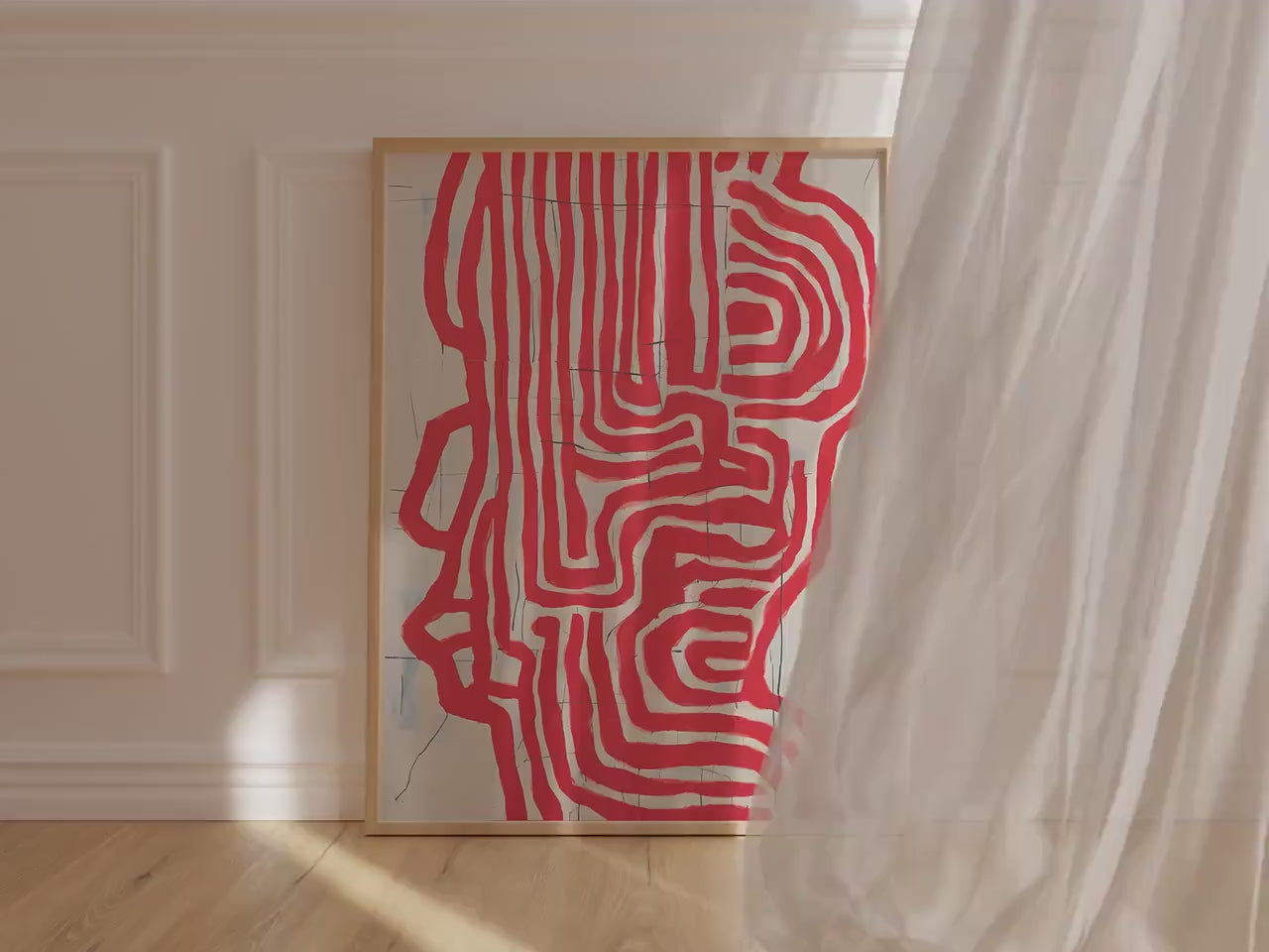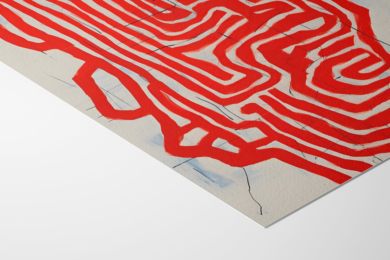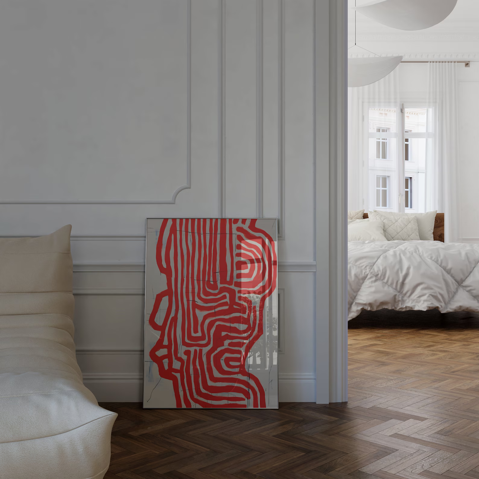 This is a piece that doesn’t ask for attention — it takes it. With punchy crimson lines and hypnotic movement, it’s part maze, part meltdown, part masterpiece. Interpret it however you want: a brain mid-process, a body mid-revolt, a system rewiring itself.