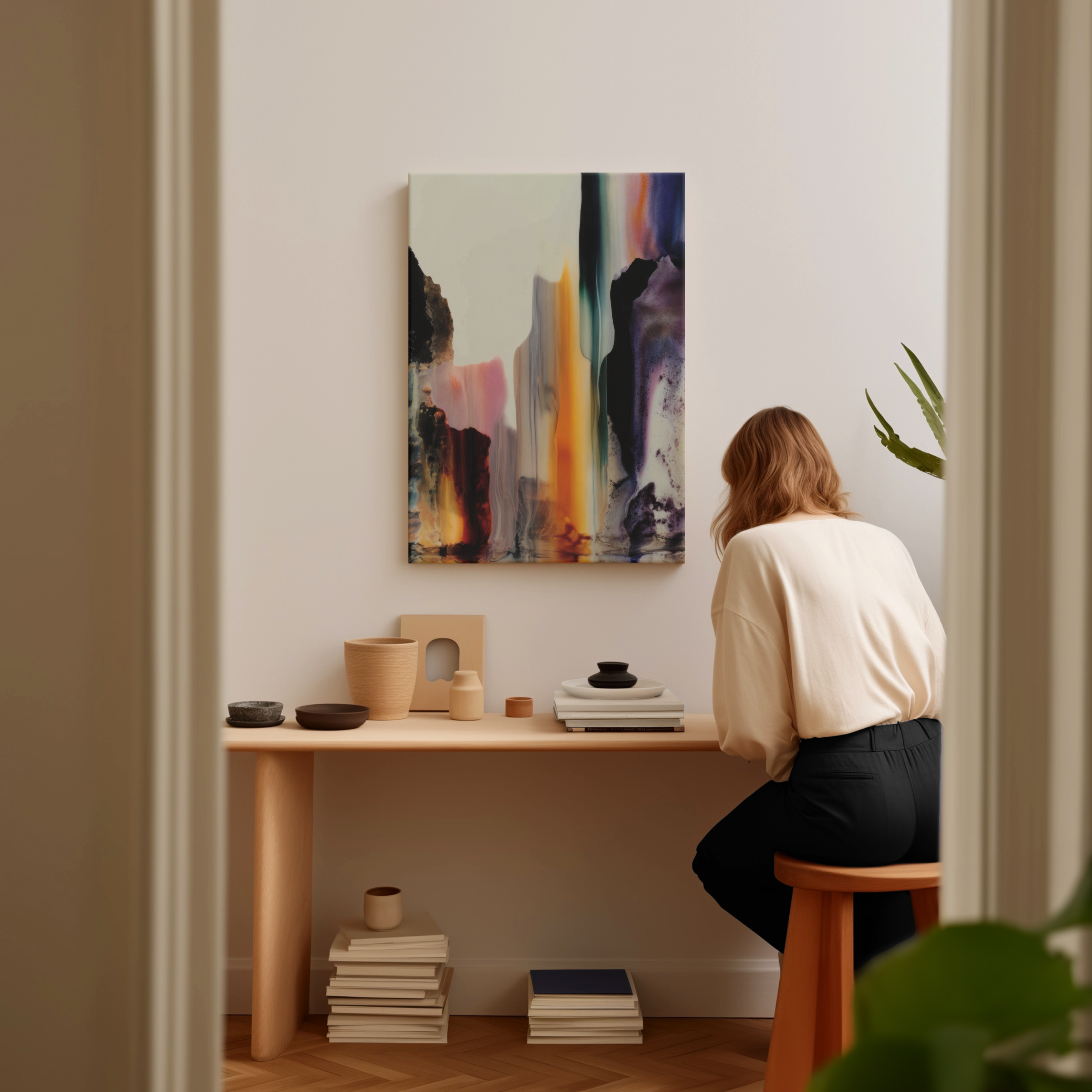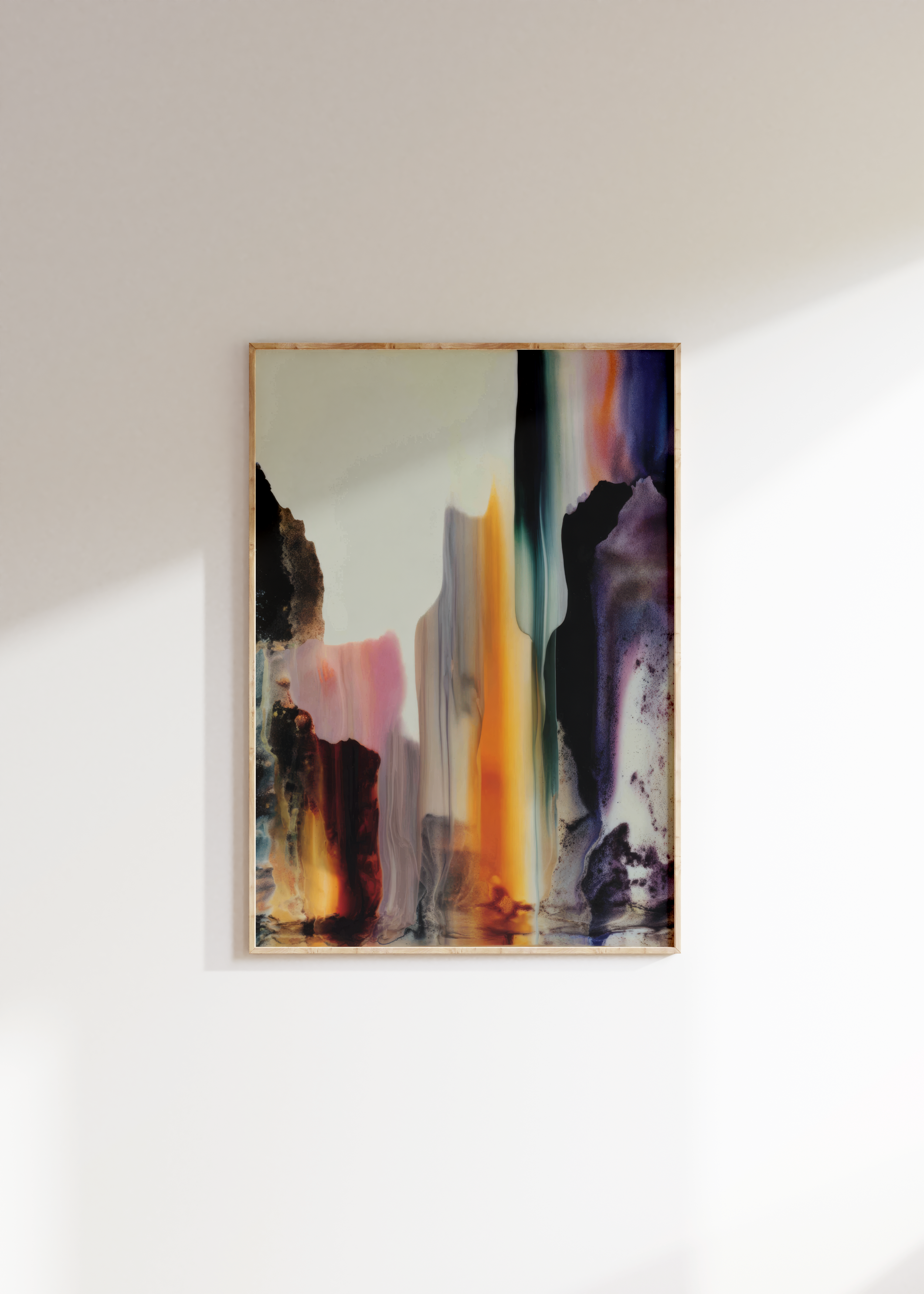 Warm amber pours into violet shadows, soft pinks bleed into deep indigos, and vertical trails stretch like the afterimage of a dream you almost remembered.