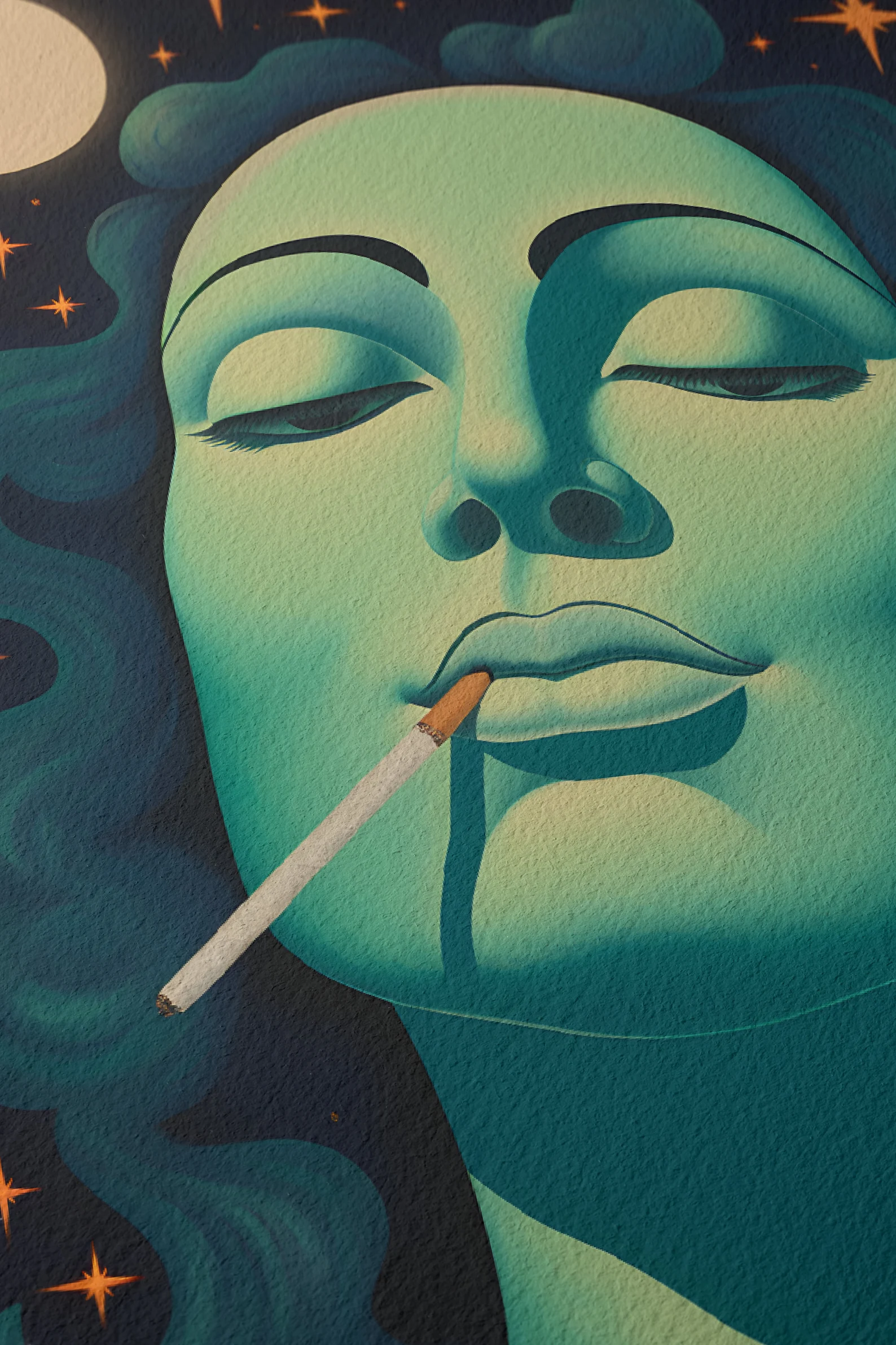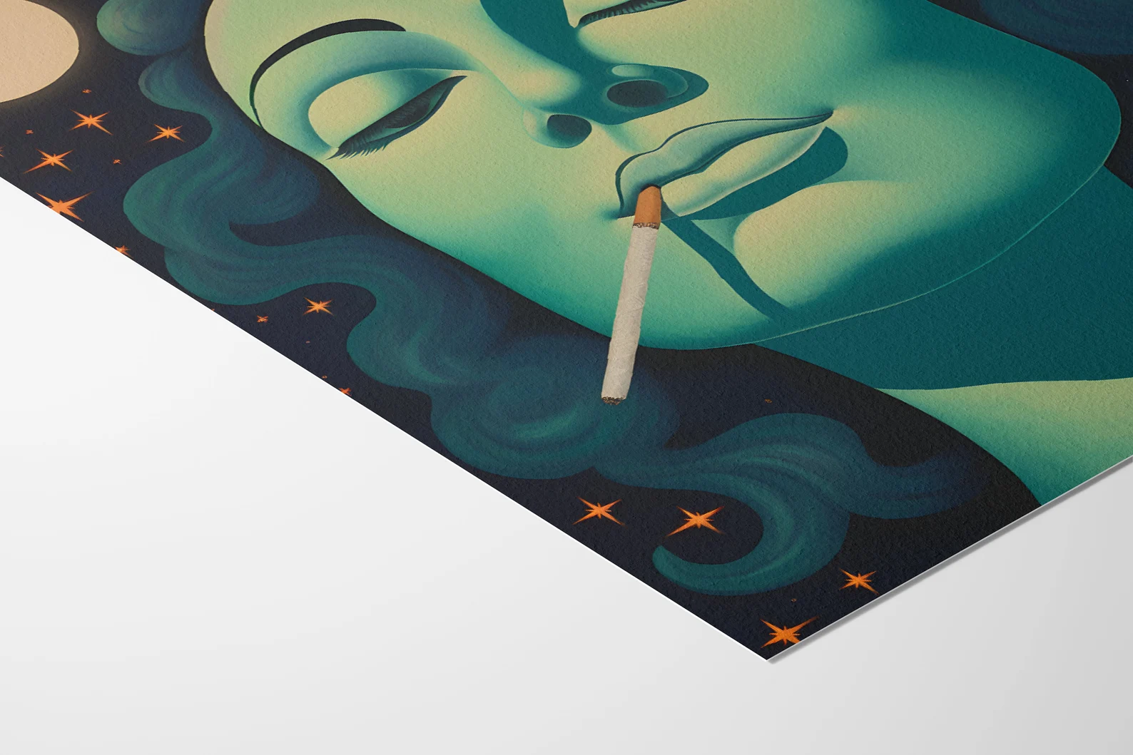 Moonlit Vice is that feeling when you step out into the night and know you’re the main character. Lit by moonlight, dripping in cool tones and cosmic confidence, this surreal portrait blends old Hollywood glam with a cosmic wink. It’s part retro siren, part astral attitude, and she’s definitely not apologizing. With her celestial stare and perfectly placed cigarette, this is a piece that owns the room. Mysterious. Magnetic. Slightly dangerous. She’s a vibe.