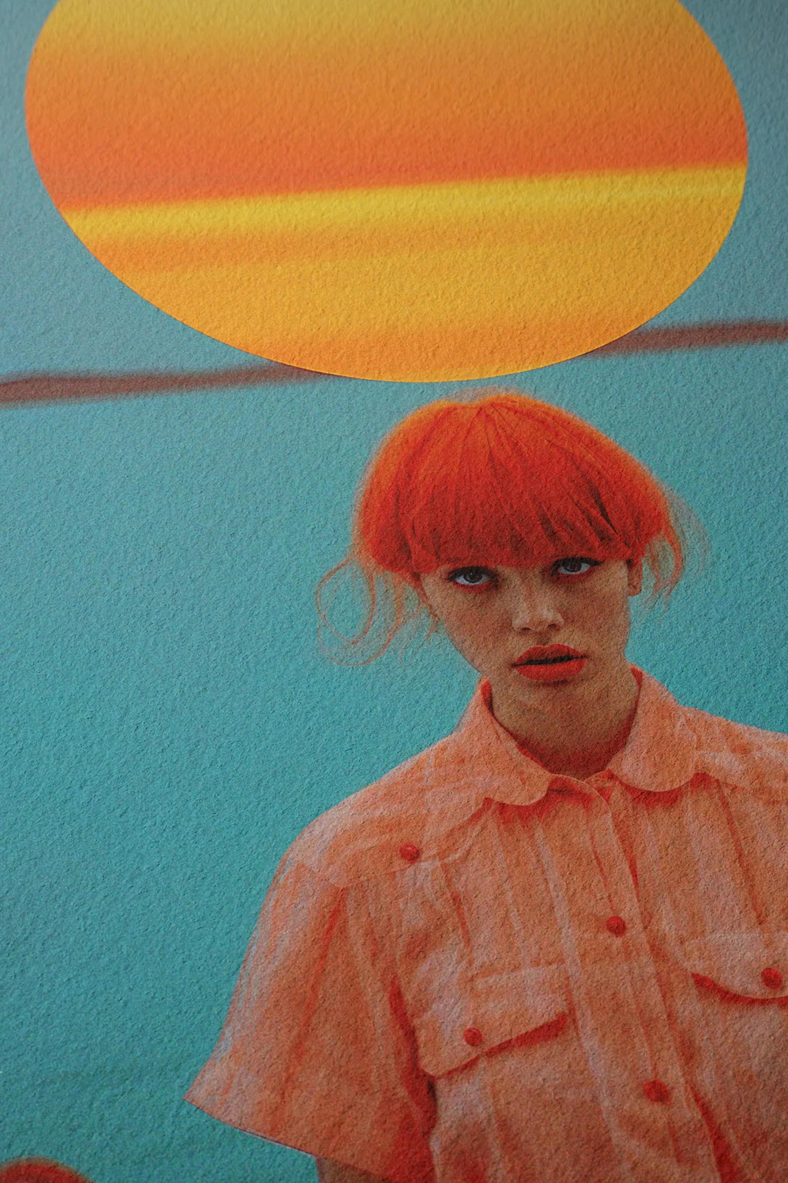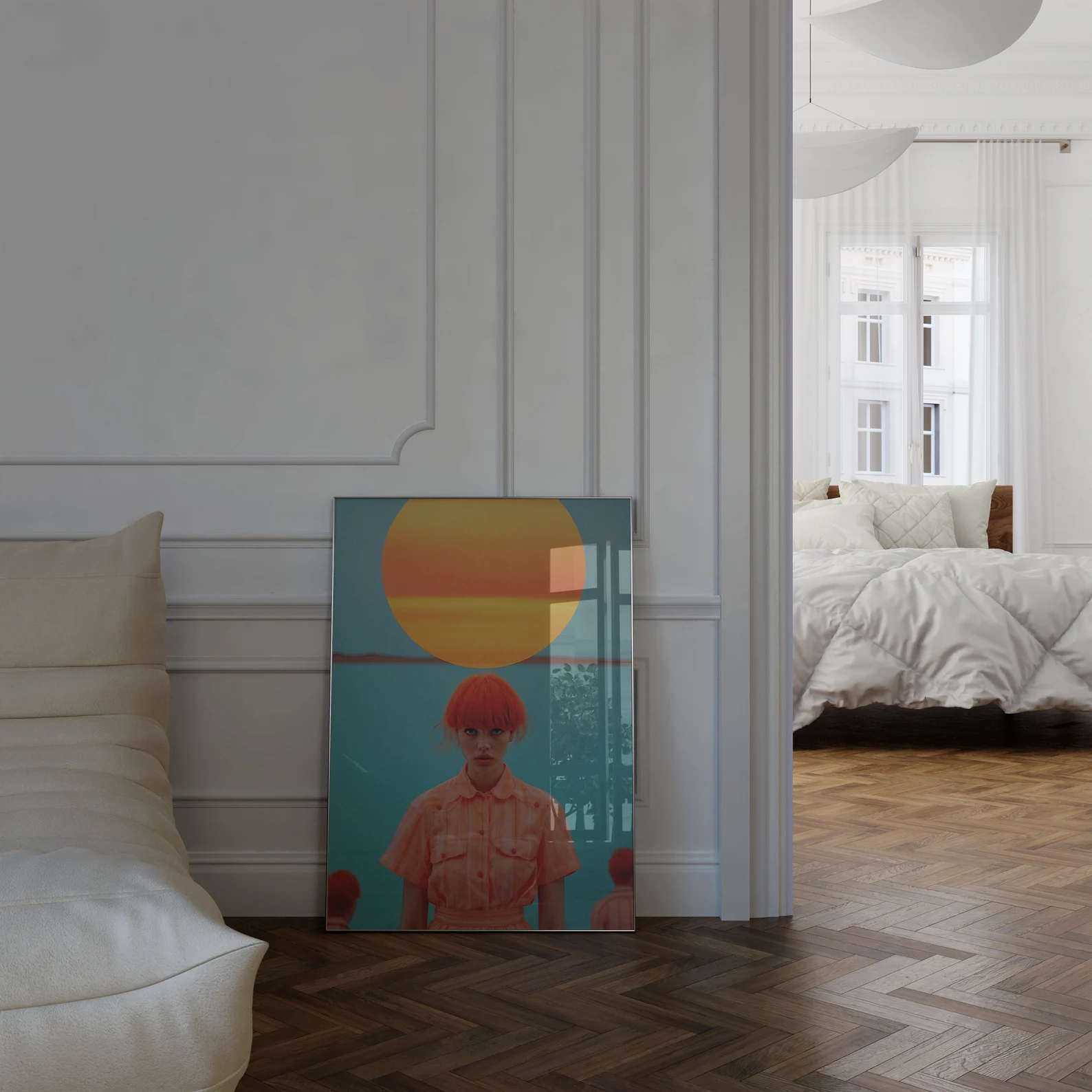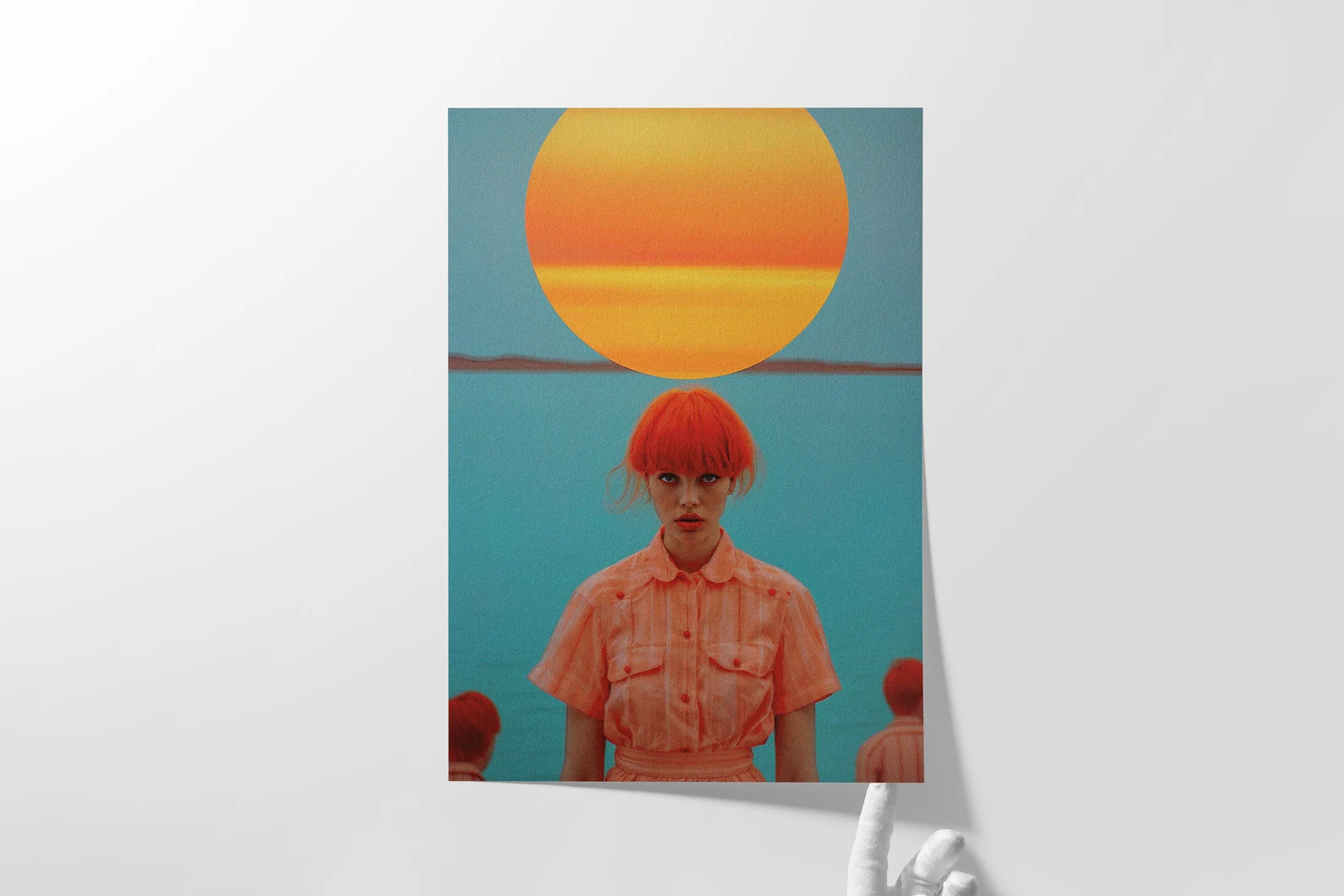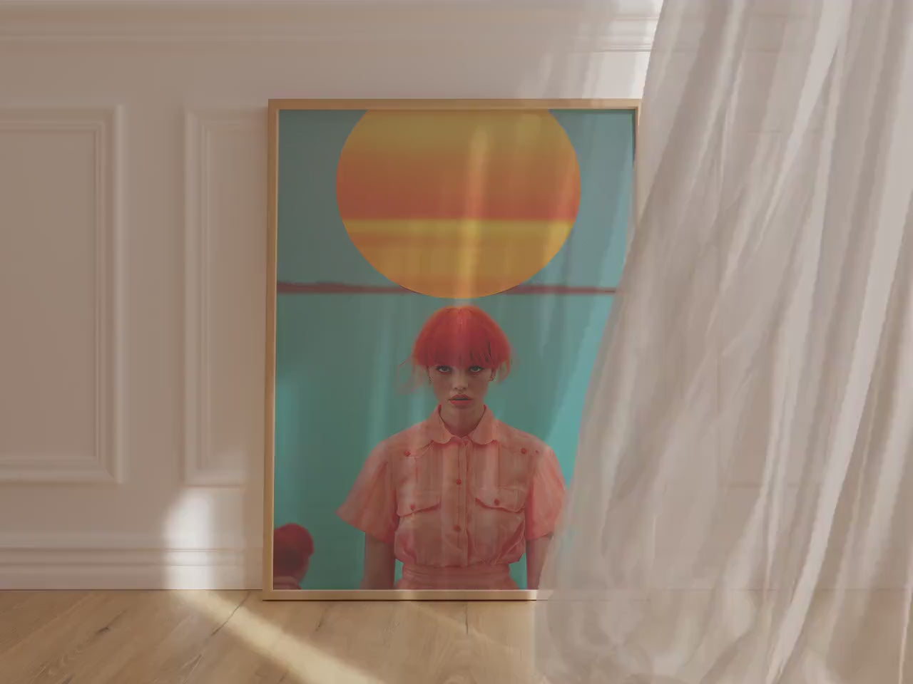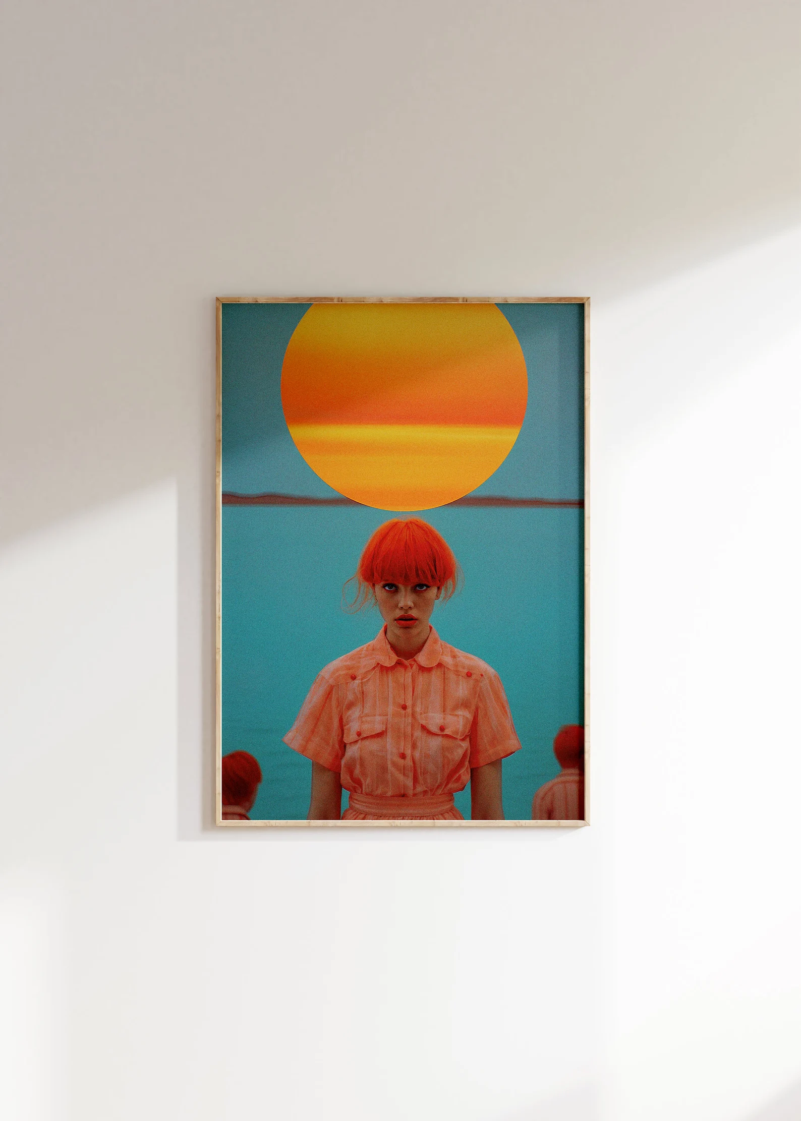 There’s no way to glance past this one. With saturated turquoise seas, a giant orange sun, and a central figure that looks like she either knows all your secrets or wants to start a revolution, Orange You in a Cult? brings high-impact surrealism straight to your walls.