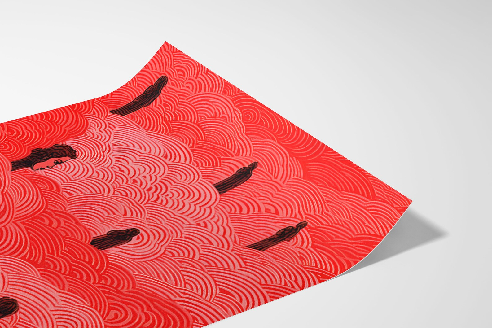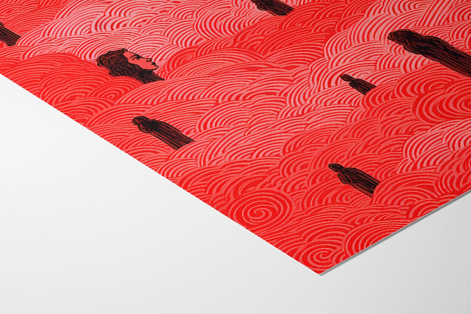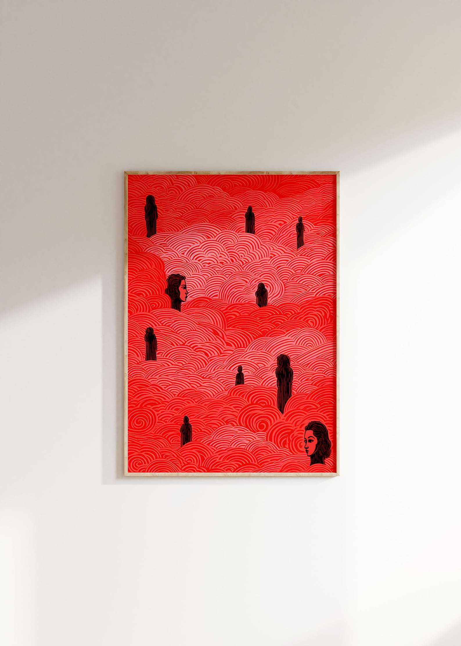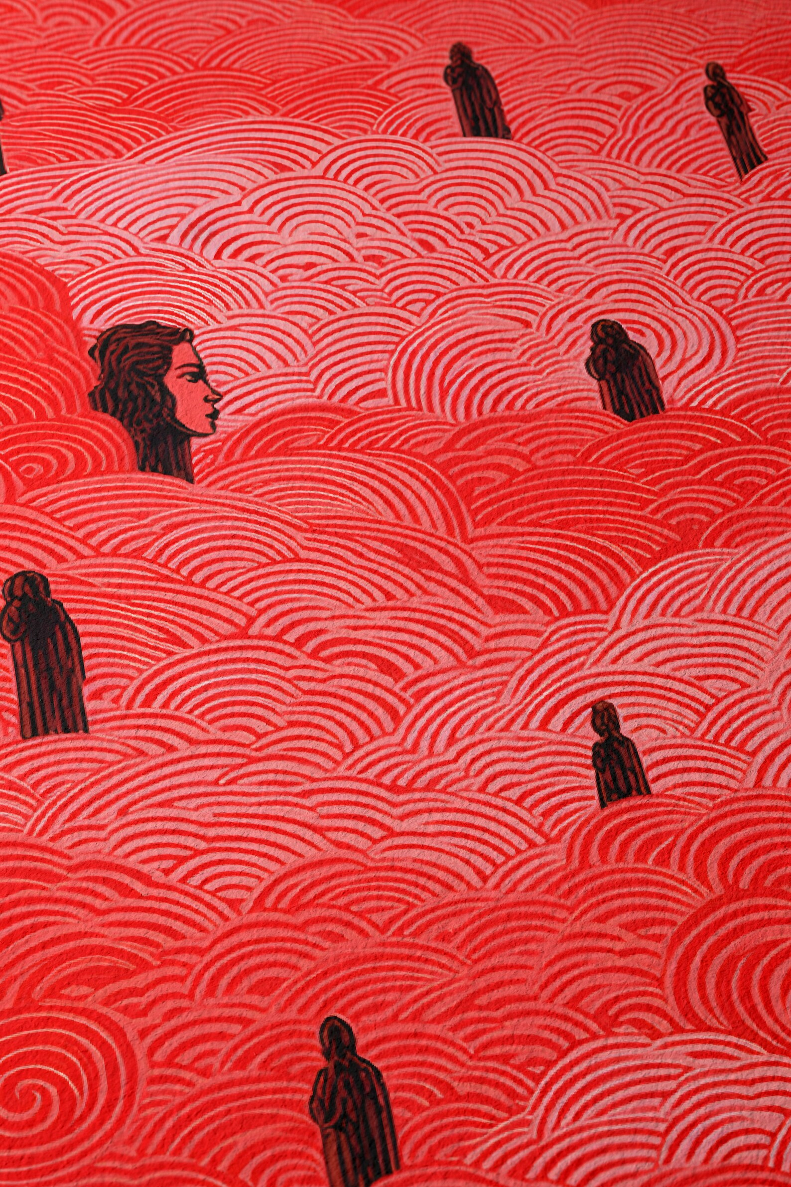 Signal in the Fog turns the volume way up on surreal atmosphere. A sea of hand-drawn red swirls rises like a fever dream, interrupted by figures that float, watch, or maybe wait. Faces emerge, disappear, reappear, it’s both charged and strangely calm, like a memory trying to come back. A piece that doesn’t just catch your eye, it lingers in your brain.