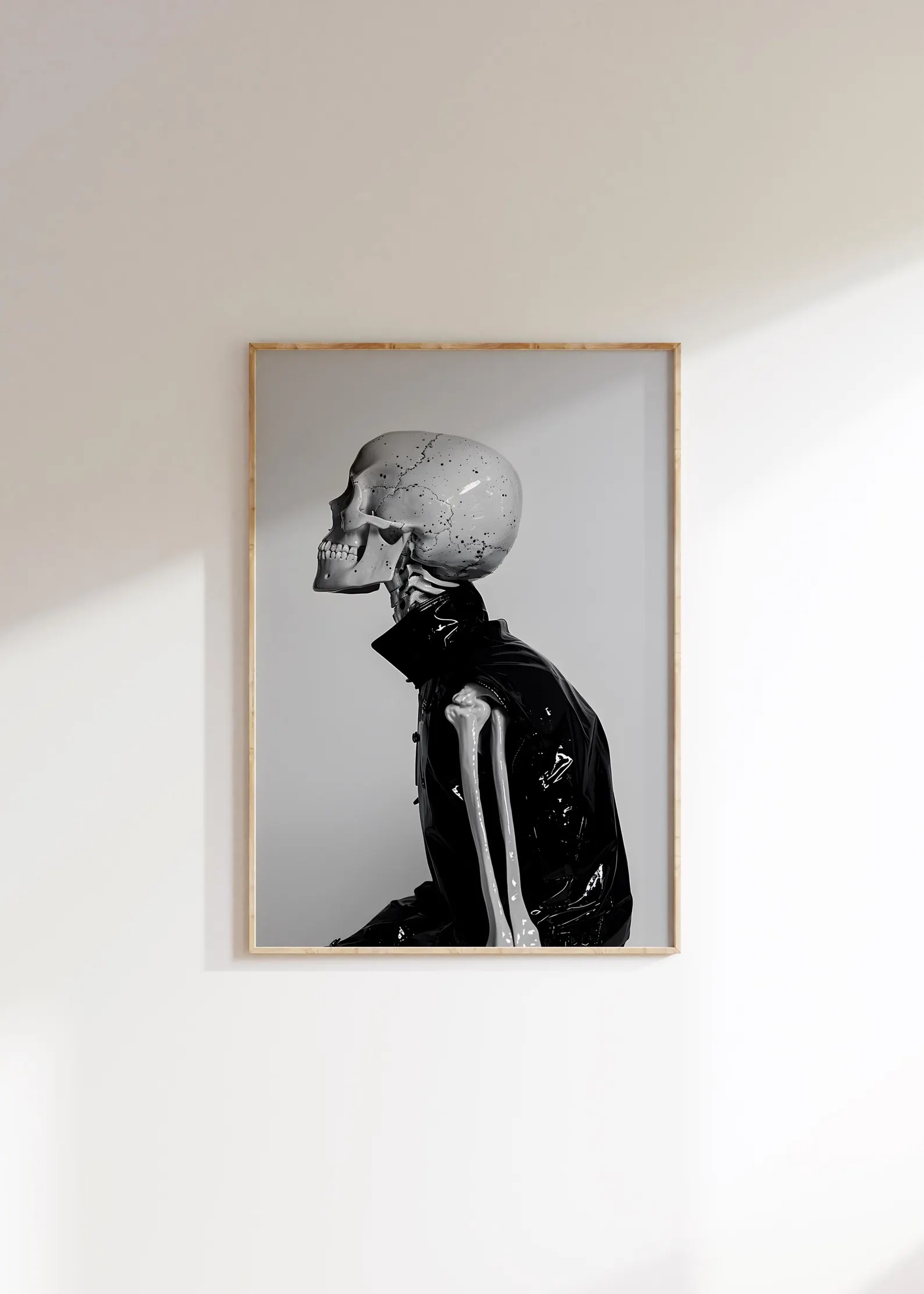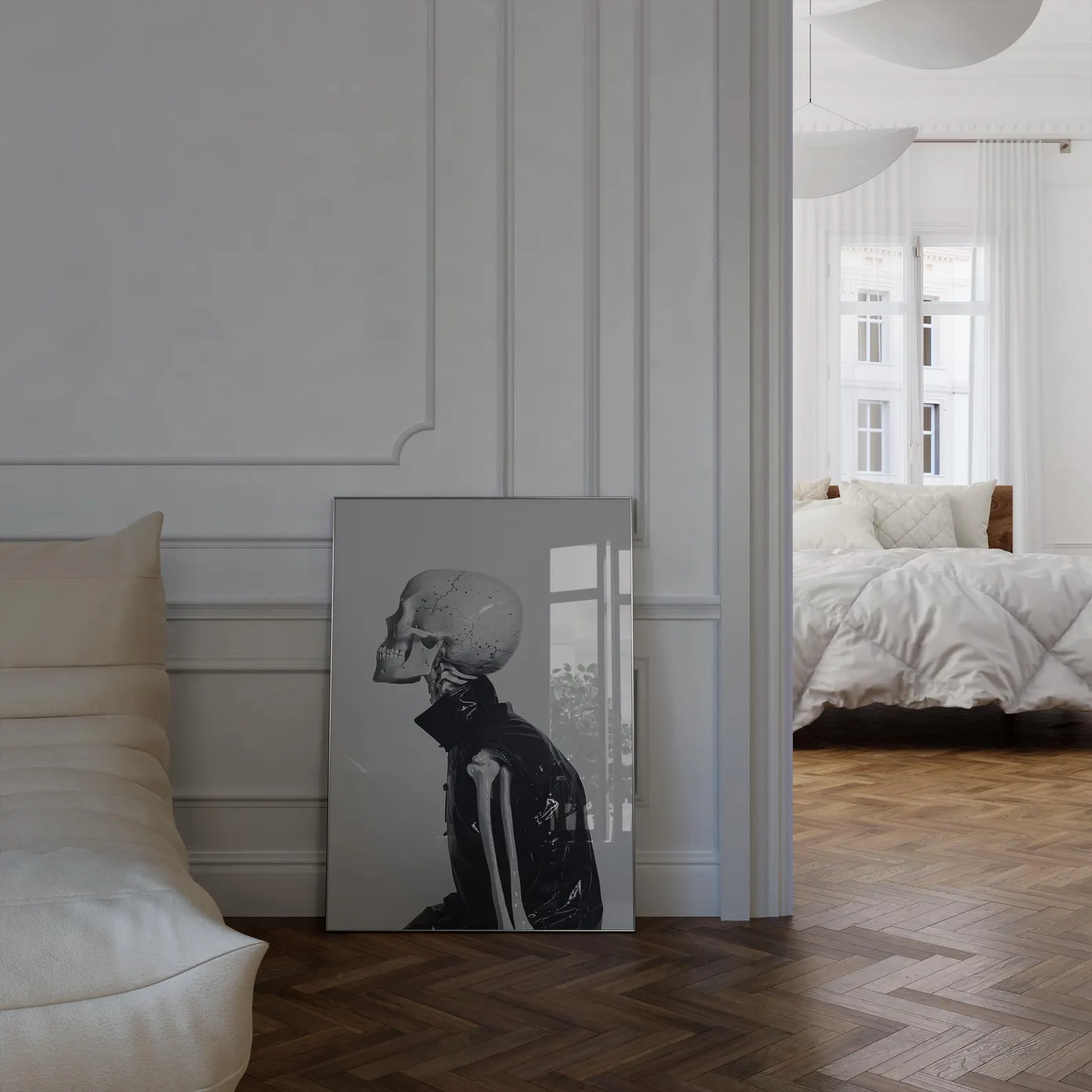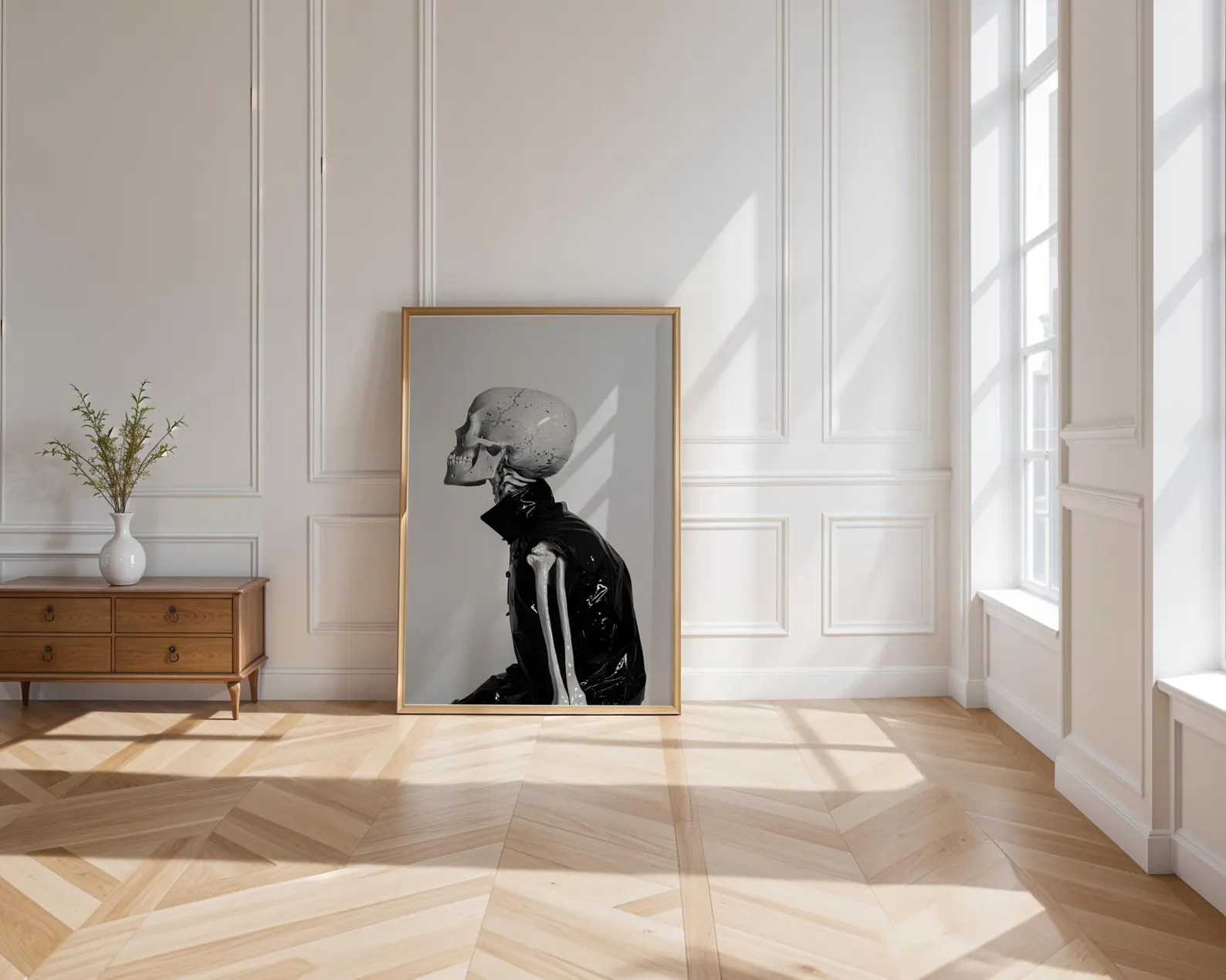 Sleek to Death is the definition of visual whiplash in the best way. A chrome-like skeleton sits posed and polished in a high-collar jacket, exuding runway energy with a side of existential cool. This piece is minimalist in palette but maximalist in attitude — clean, conceptual, and just the right amount of creepy. The kind of art that starts conversations and silently judges your outfit. Iconic.