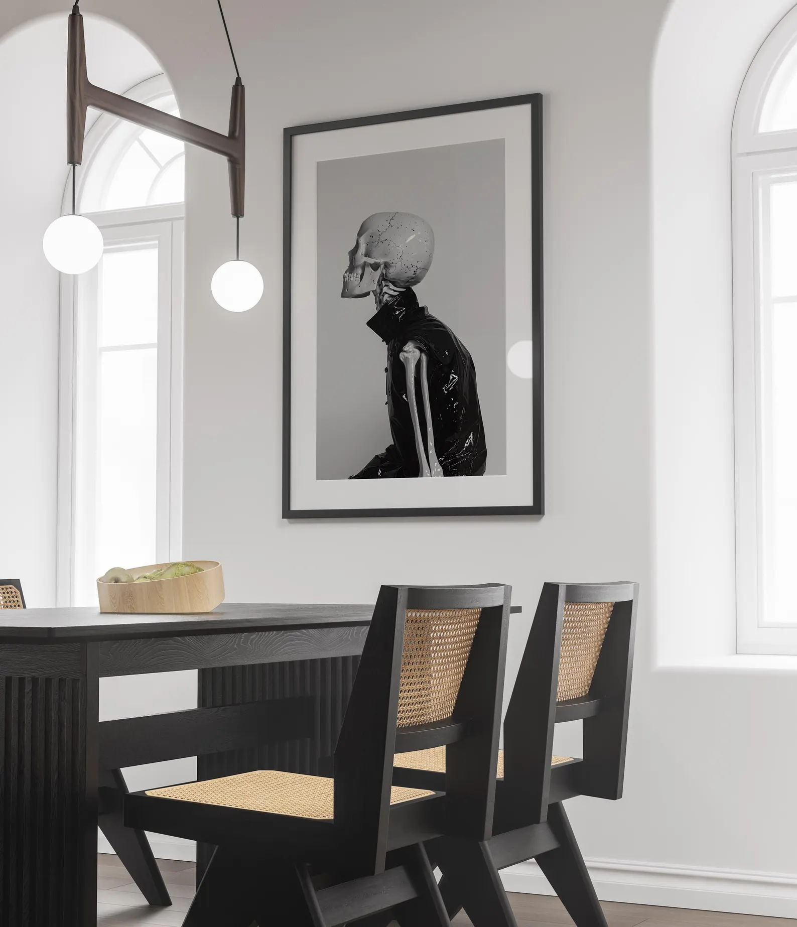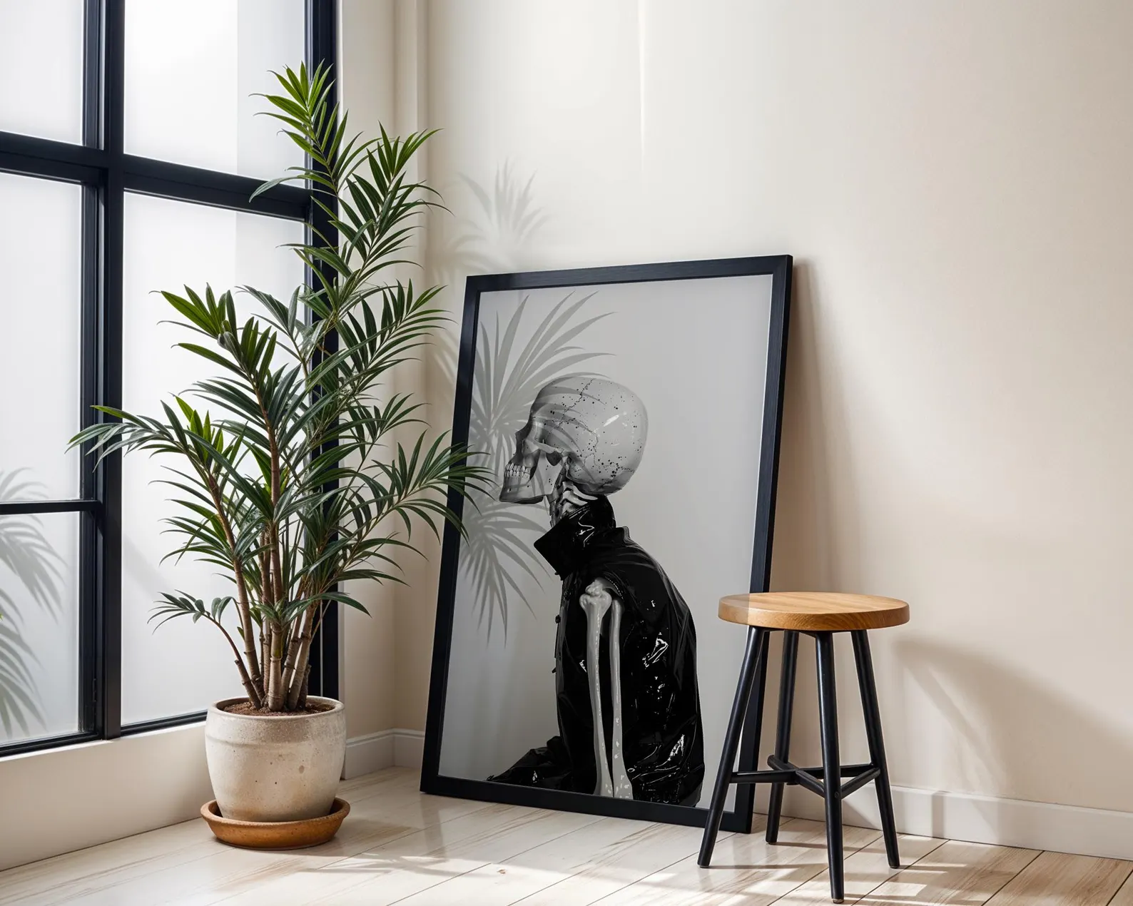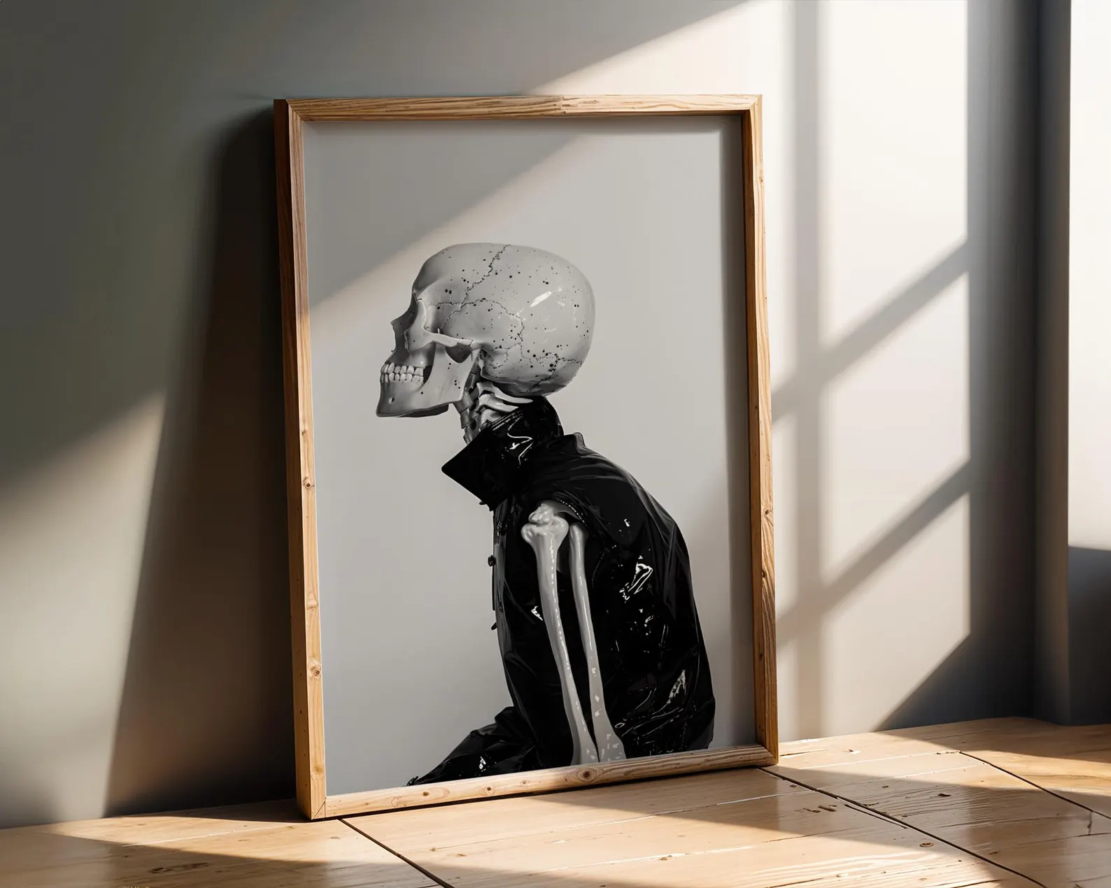 Sleek to Death is the definition of visual whiplash in the best way. A chrome-like skeleton sits posed and polished in a high-collar jacket, exuding runway energy with a side of existential cool. This piece is minimalist in palette but maximalist in attitude — clean, conceptual, and just the right amount of creepy. The kind of art that starts conversations and silently judges your outfit. Iconic.