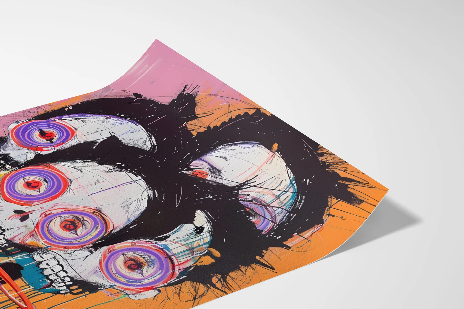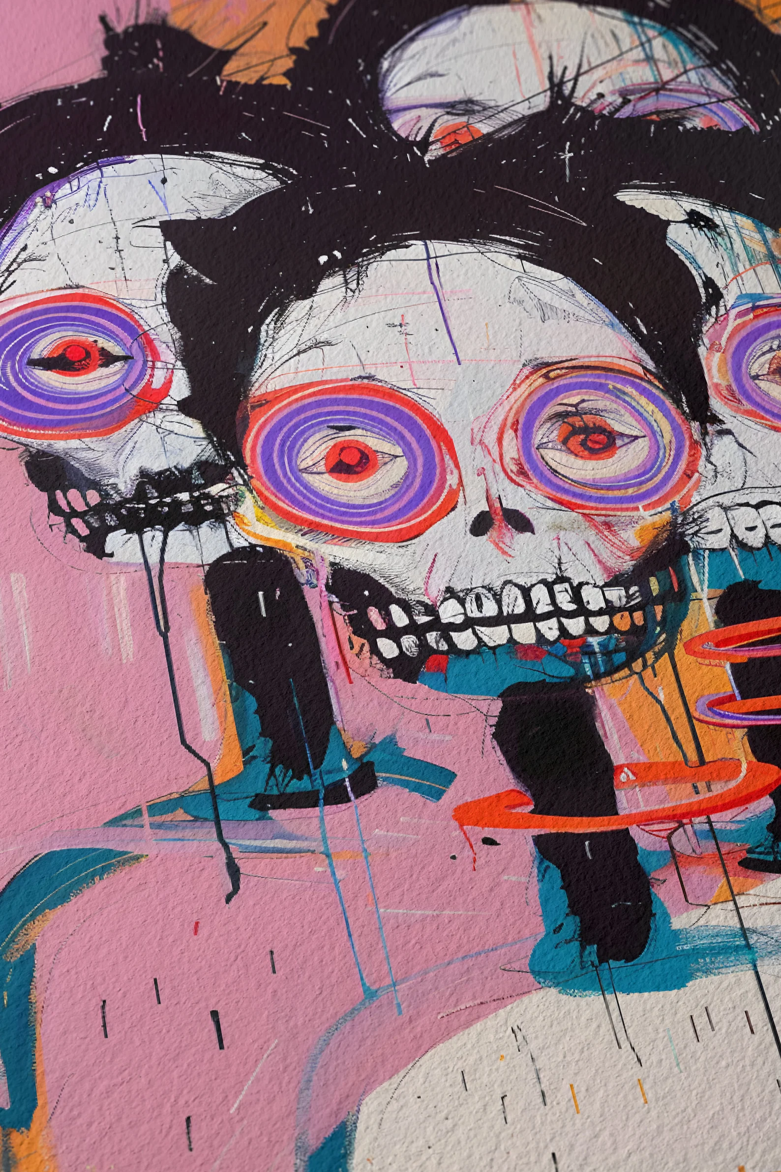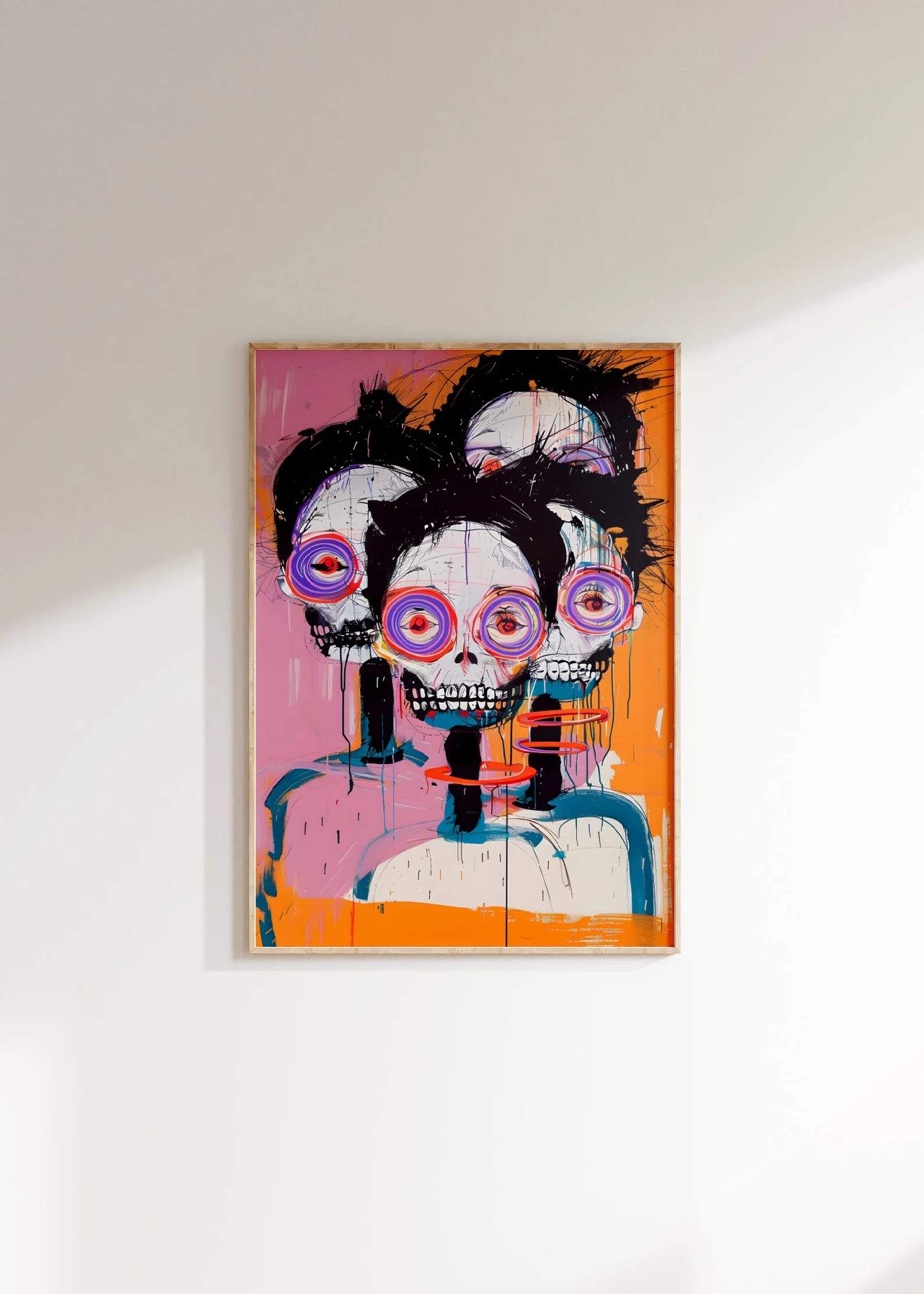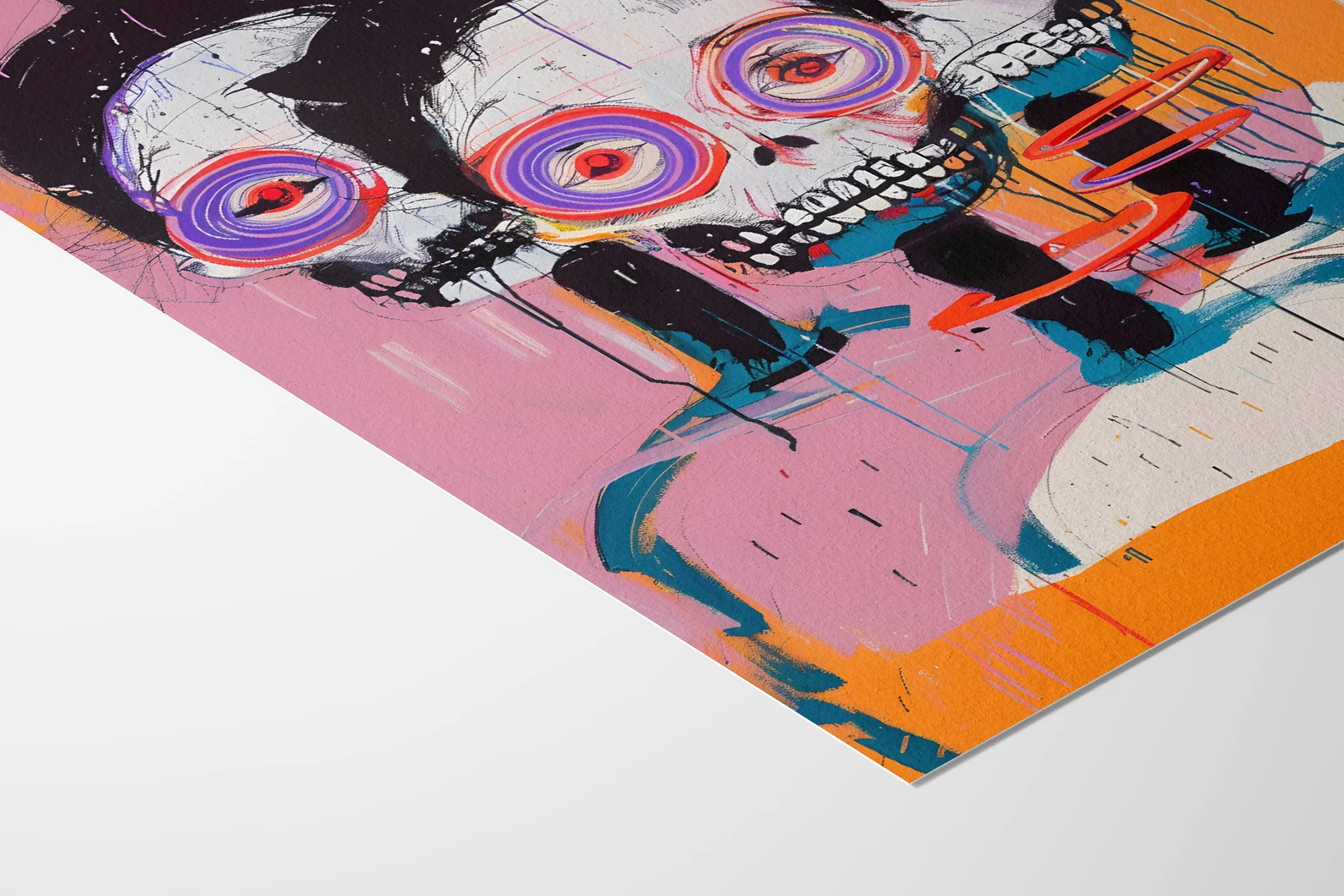 An explosion of colour, energy, and existential charm — This Is Fine, Actually is for the bold. Neon spiral eyes, jagged brushwork, and triple skull realness give this piece maximum drama with a wink. It’s the kind of print that doesn’t ask for attention. It steals it, runs off with it, and throws a rave in your hallway. Eye-catching? Yes.