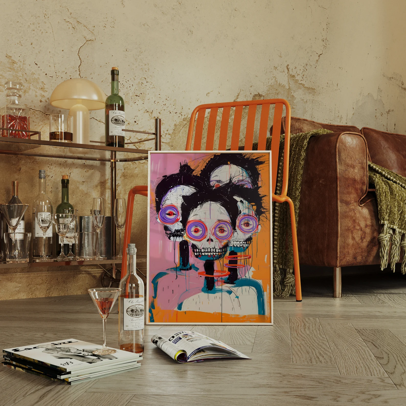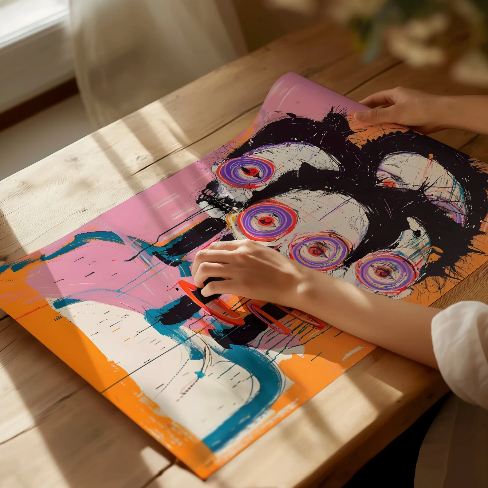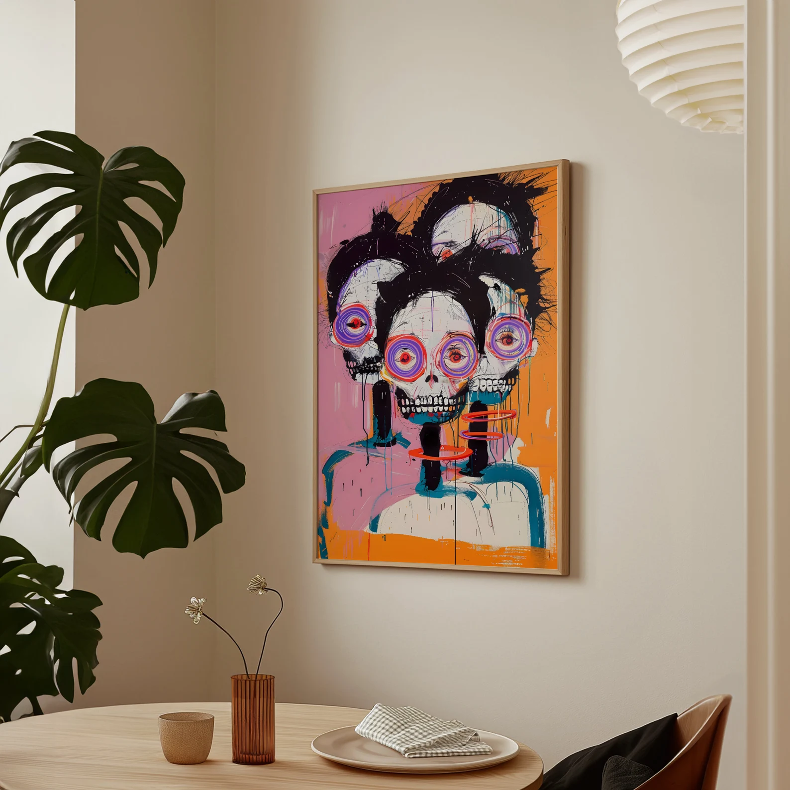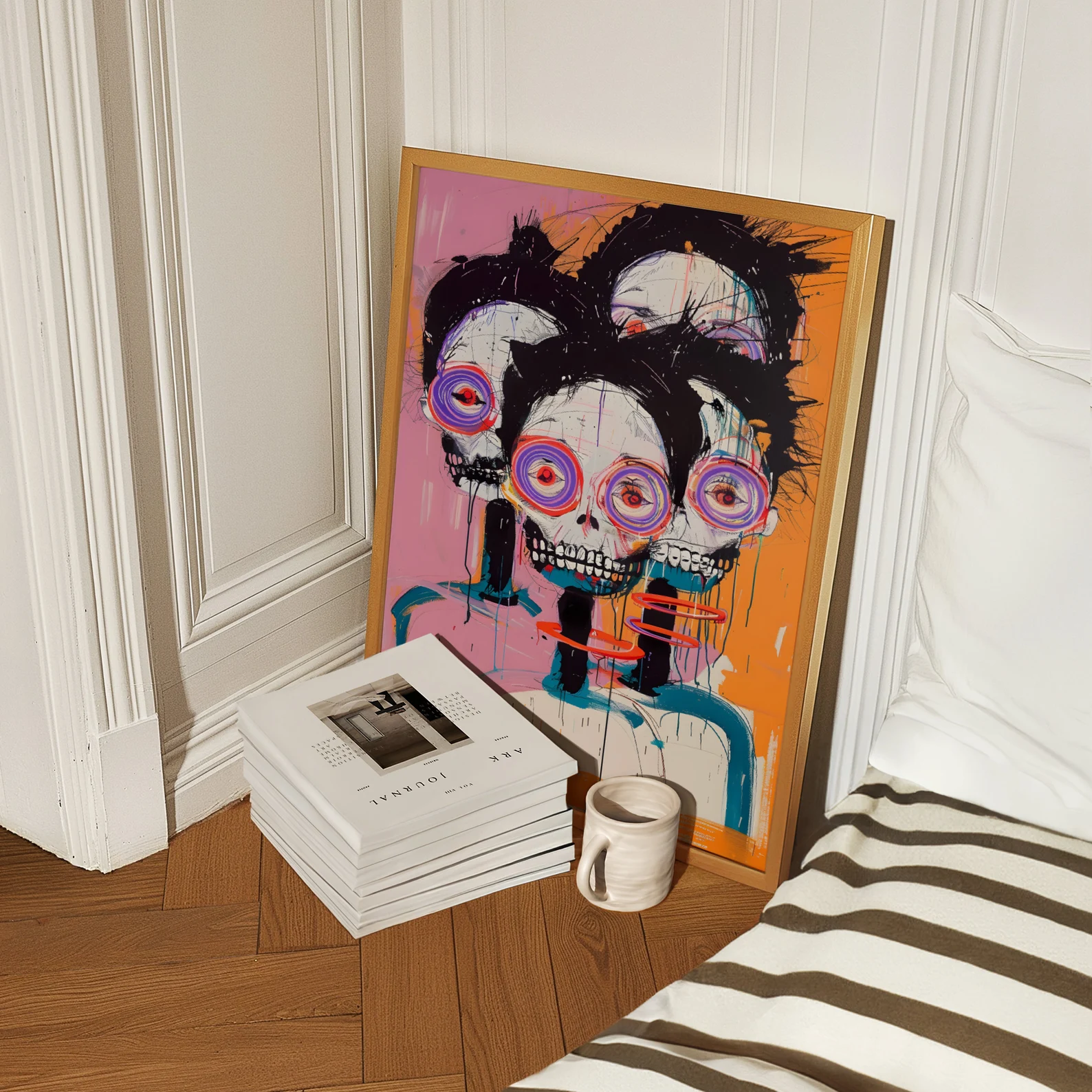 An explosion of colour, energy, and existential charm — This Is Fine, Actually is for the bold. Neon spiral eyes, jagged brushwork, and triple skull realness give this piece maximum drama with a wink. It’s the kind of print that doesn’t ask for attention. It steals it, runs off with it, and throws a rave in your hallway. Eye-catching? Yes.