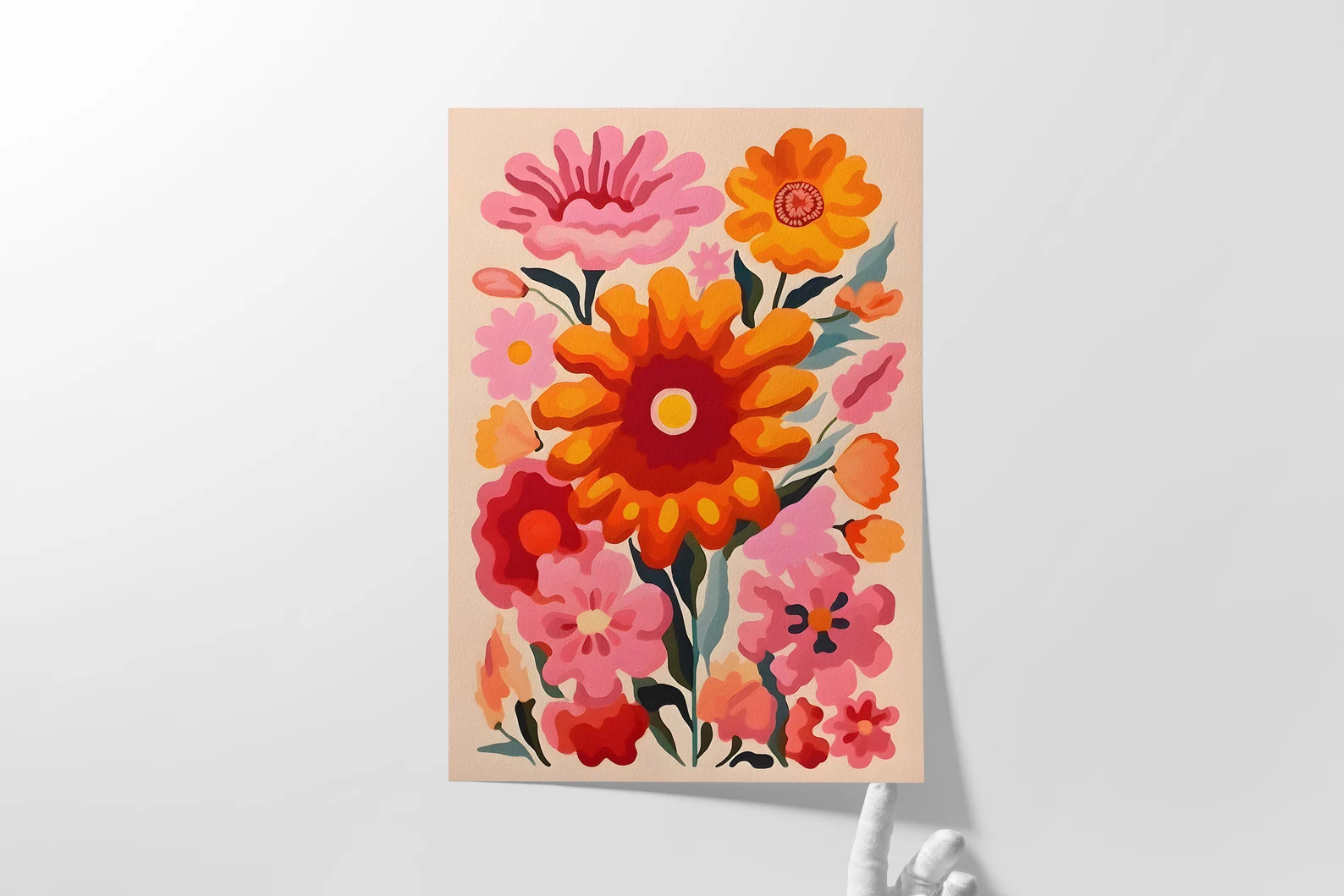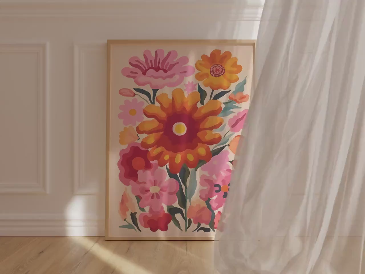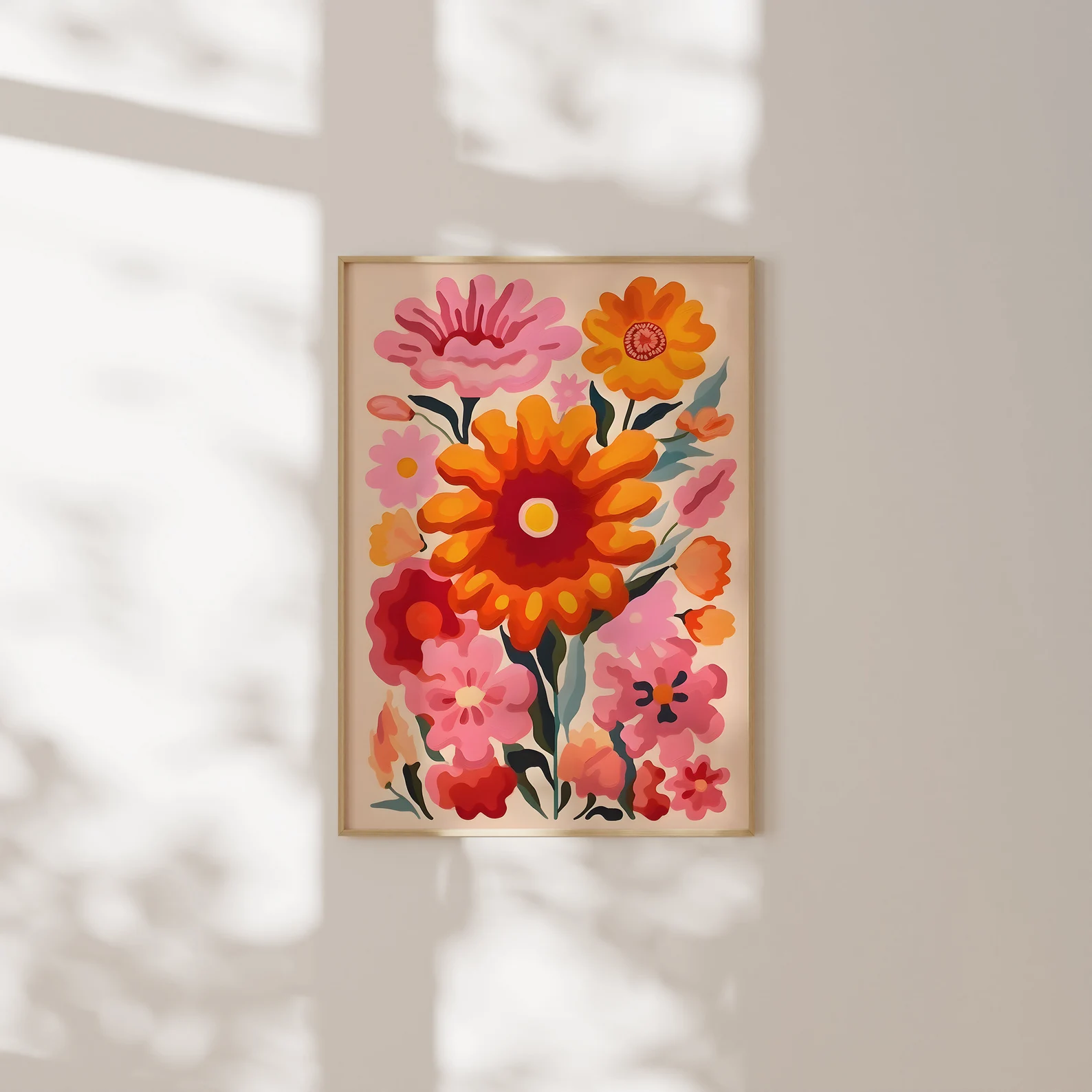 If sunshine had a hobby, this would be it. Too Many Flowers, Not Sorry is a celebration of maximalist joy, packing punchy pinks, flaming oranges, and unapologetically oversized blooms into one wild bouquet of a print. It’s like a summer anthem for your walls, loud, floral, and absolutely in bloom.