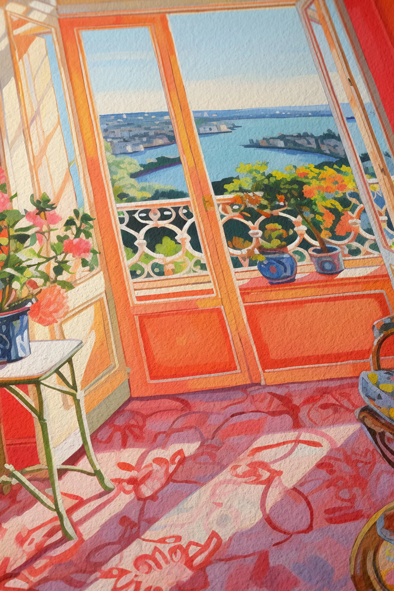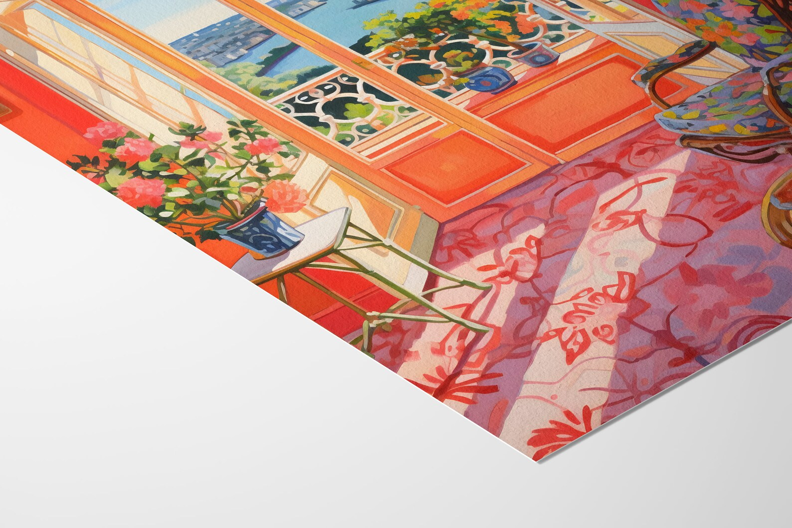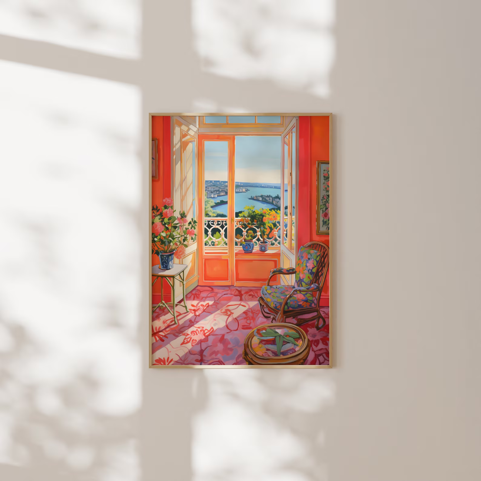 Crank the serotonin all the way up. “View Goals” is what happens when your Mediterranean daydream gets framed. Vibrant coral walls, lush flowers, and a view that says, “let’s never go back inside” — this art print is pure visual vitamin D. Hang it where your space needs an instant glow-up (and a reminder that life should feel this good).