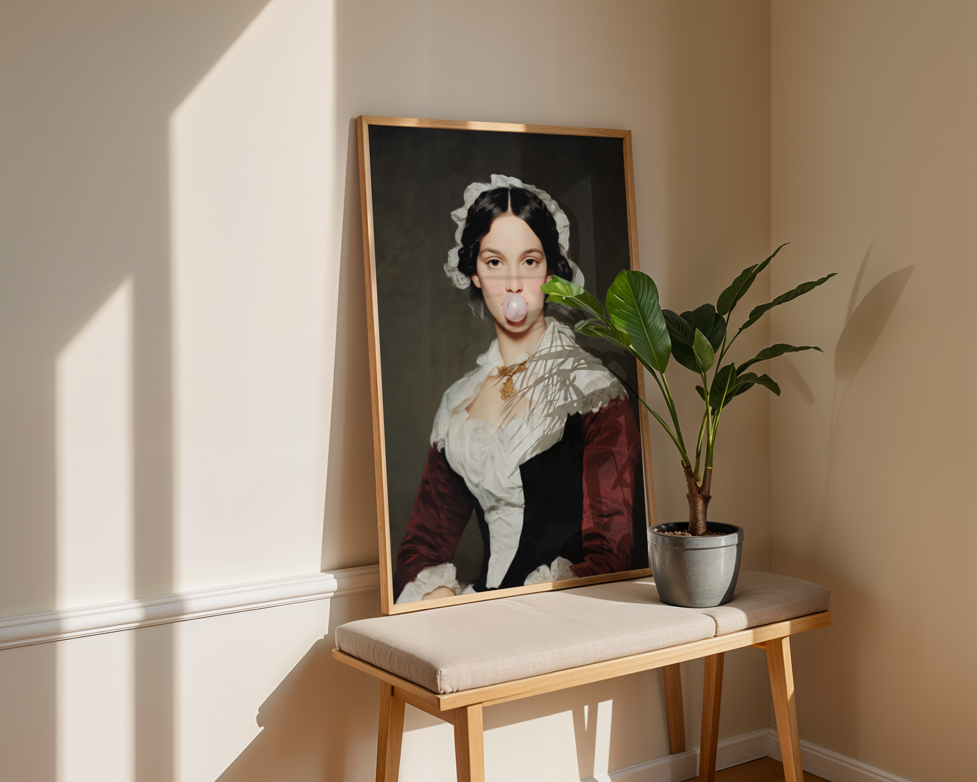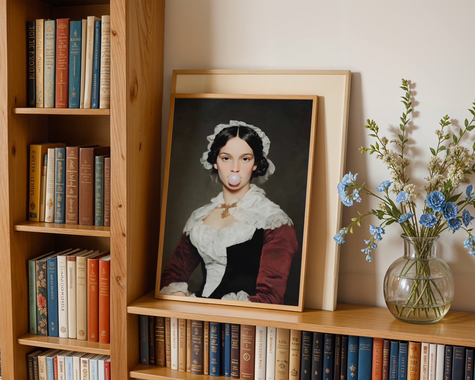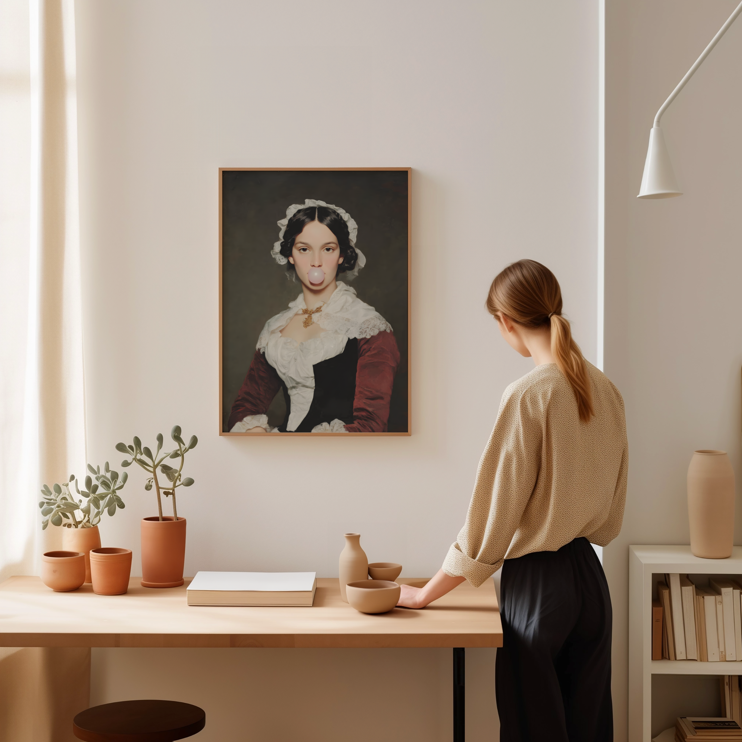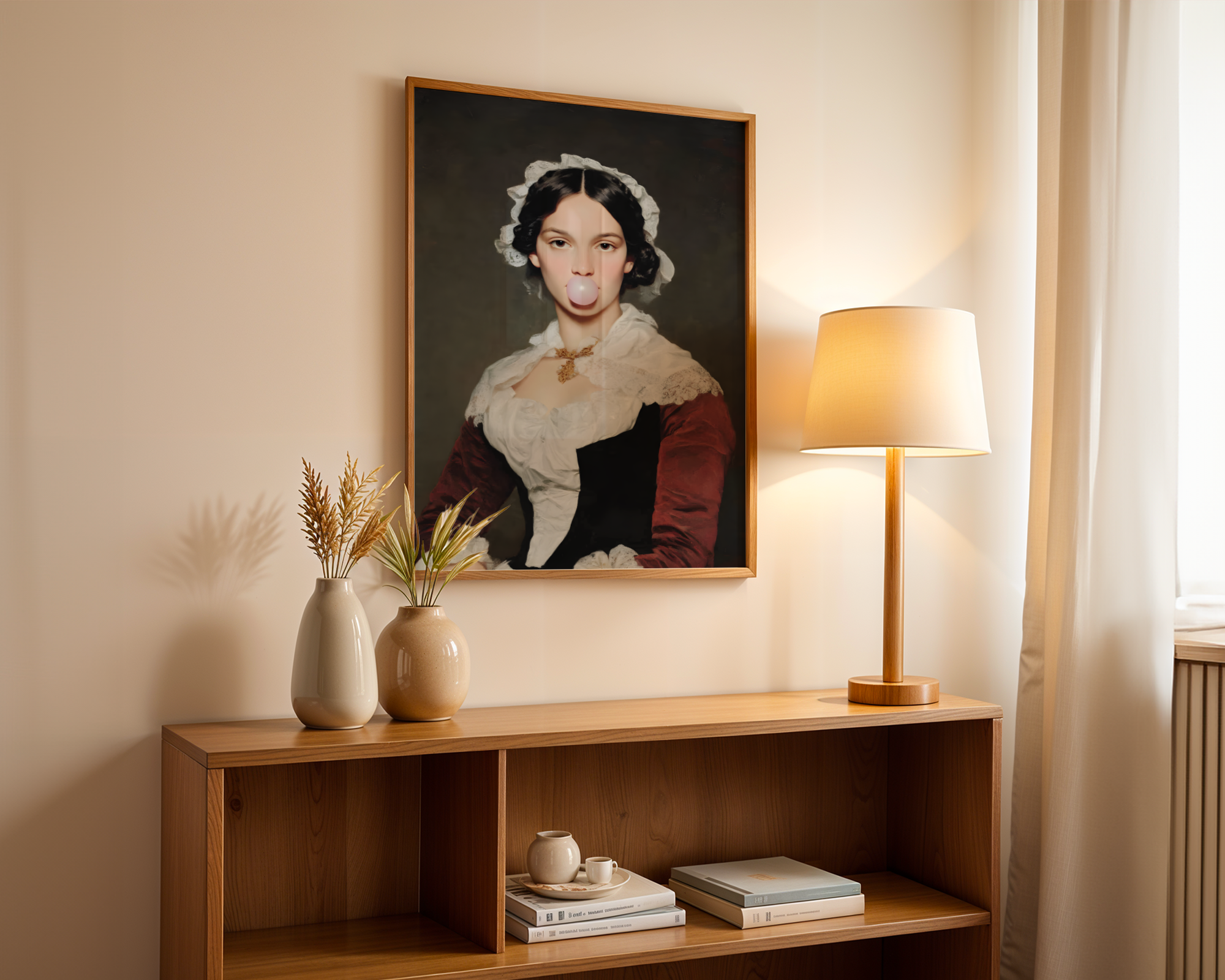 Want Gum? is what happens when elegance meets irreverence — a collision of old-world oil painting aesthetic and contemporary sass. The lace, the poise, the posture… and then boom: bubblegum. It’s the kind of wall art that stops people in their tracks (and maybe makes them snort-laugh a little).