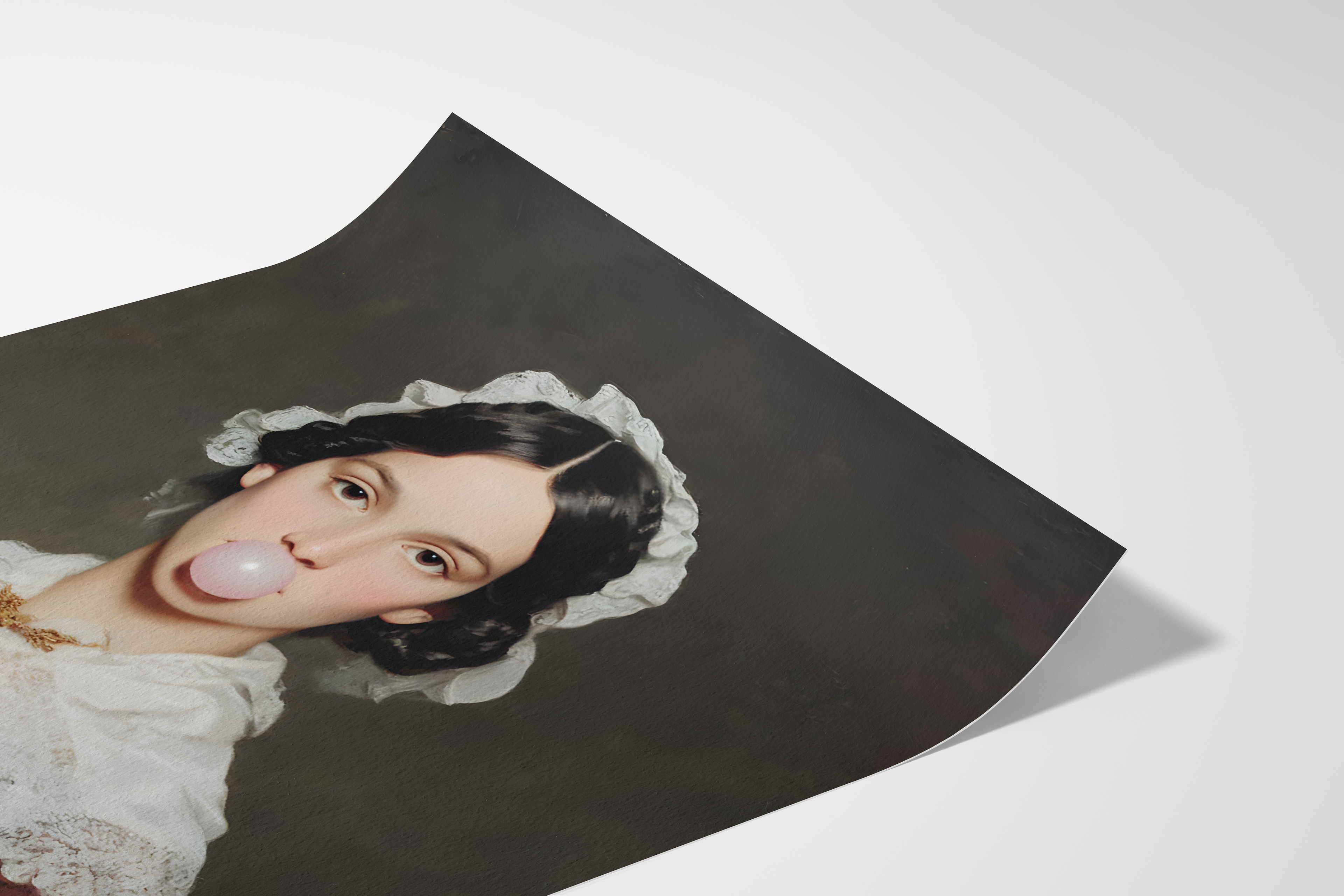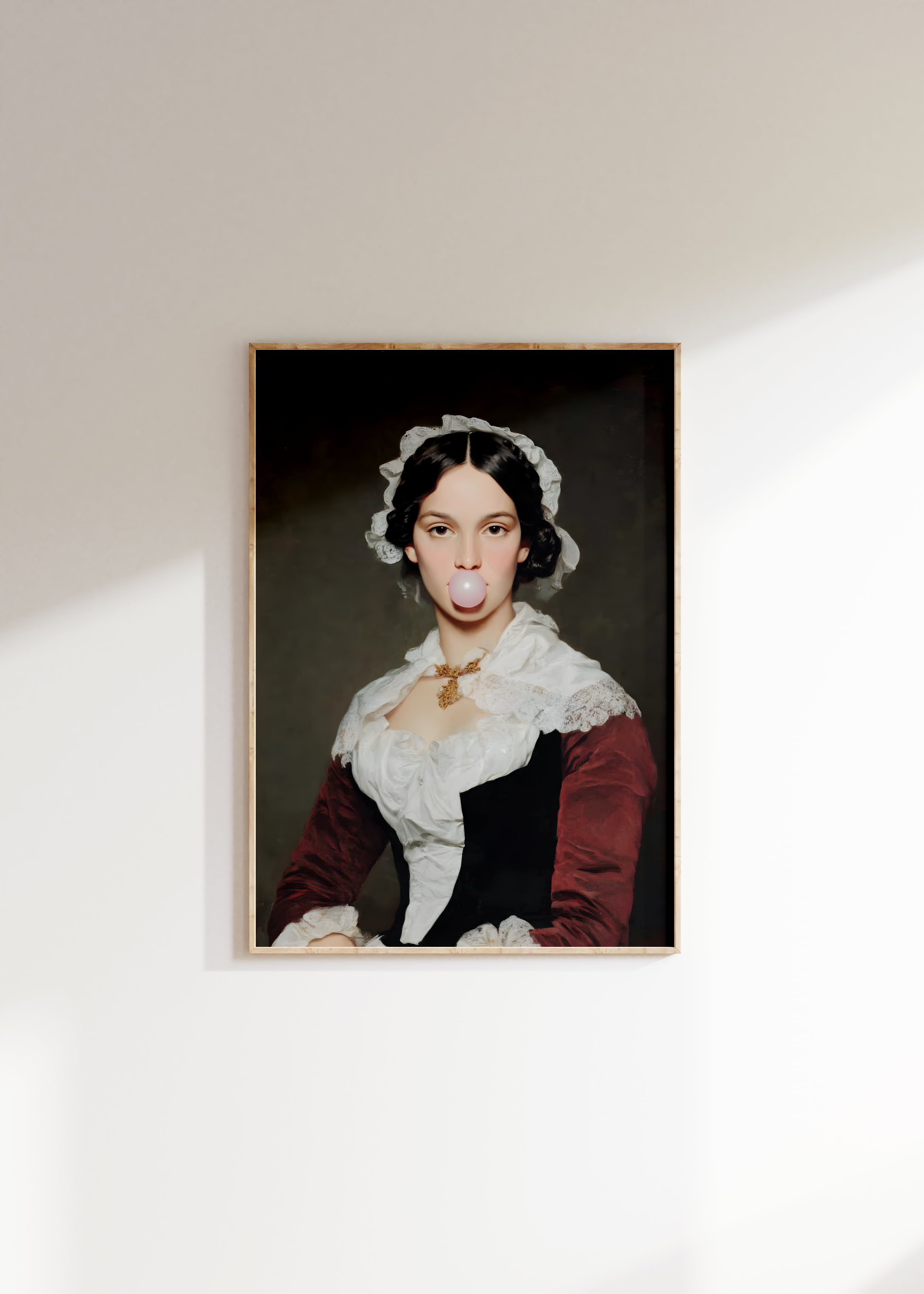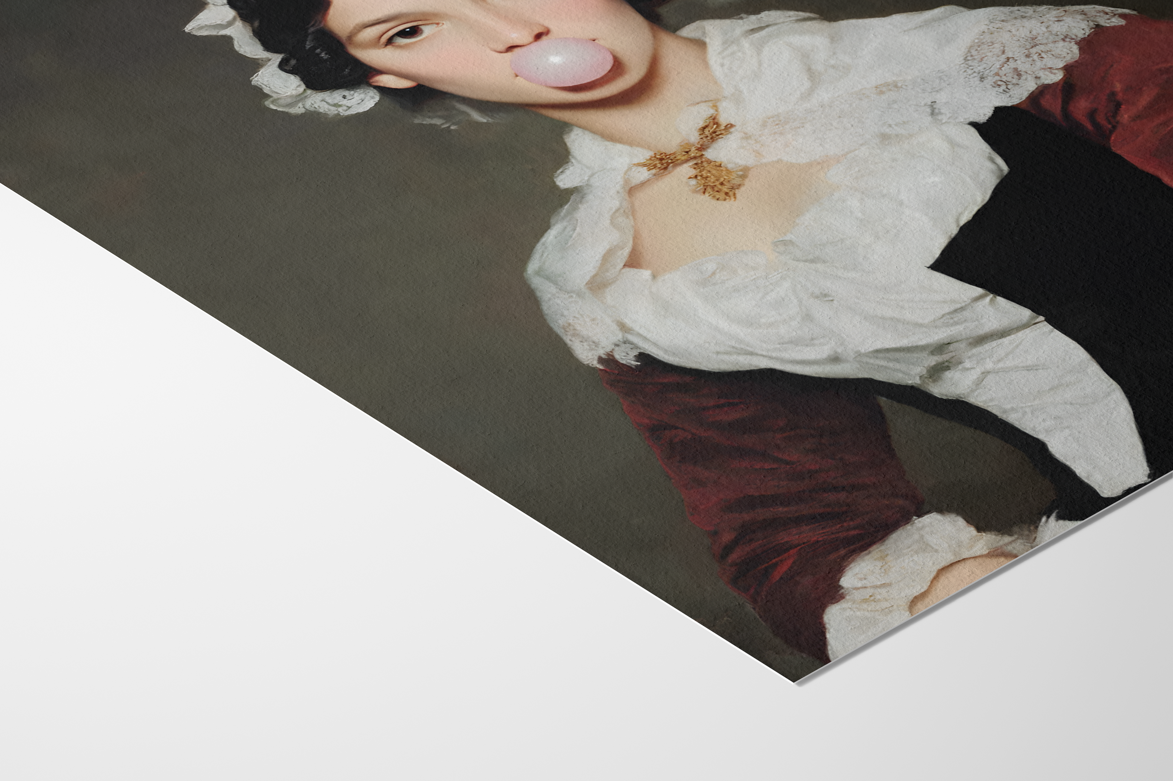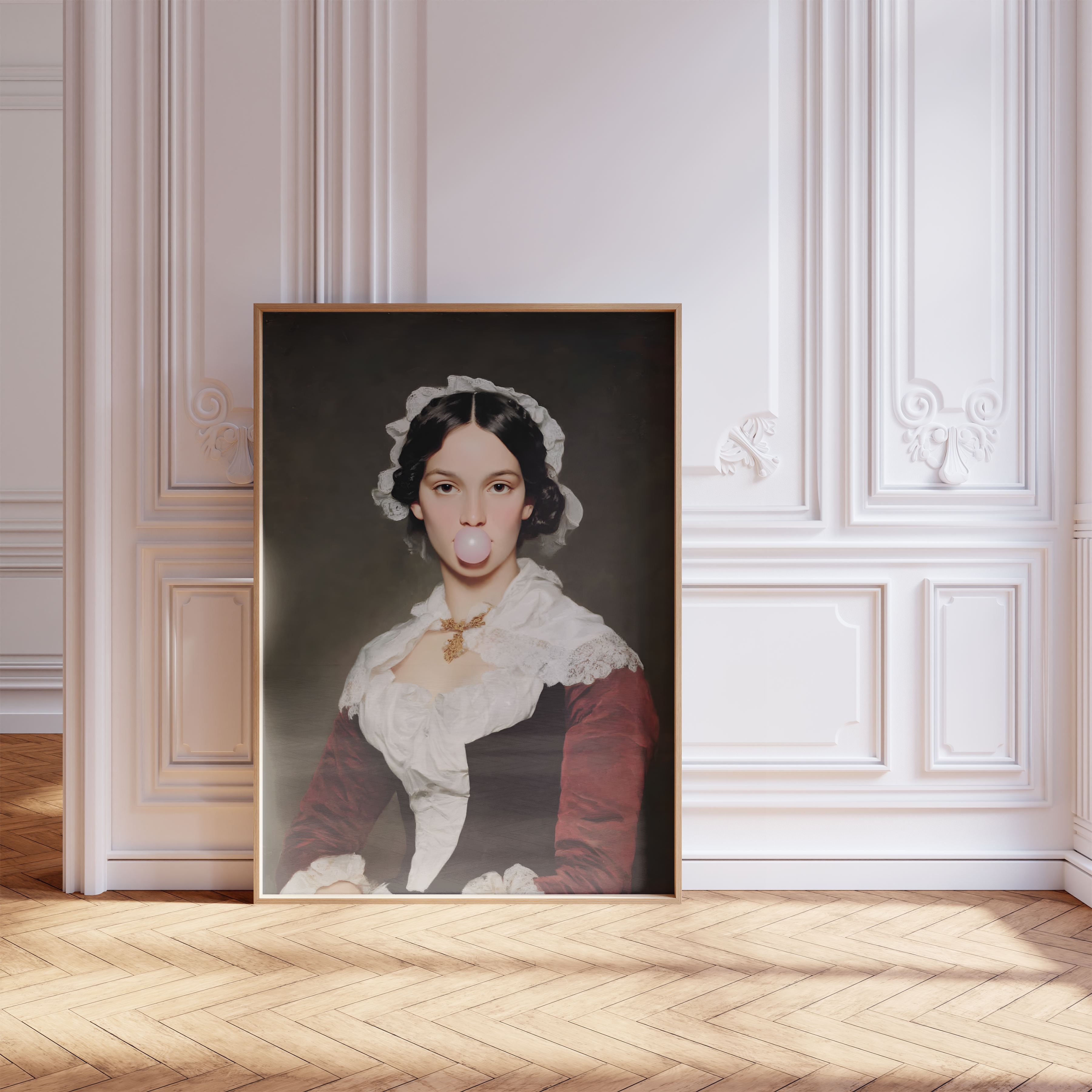 Want Gum? is what happens when elegance meets irreverence — a collision of old-world oil painting aesthetic and contemporary sass. The lace, the poise, the posture… and then boom: bubblegum. It’s the kind of wall art that stops people in their tracks (and maybe makes them snort-laugh a little).