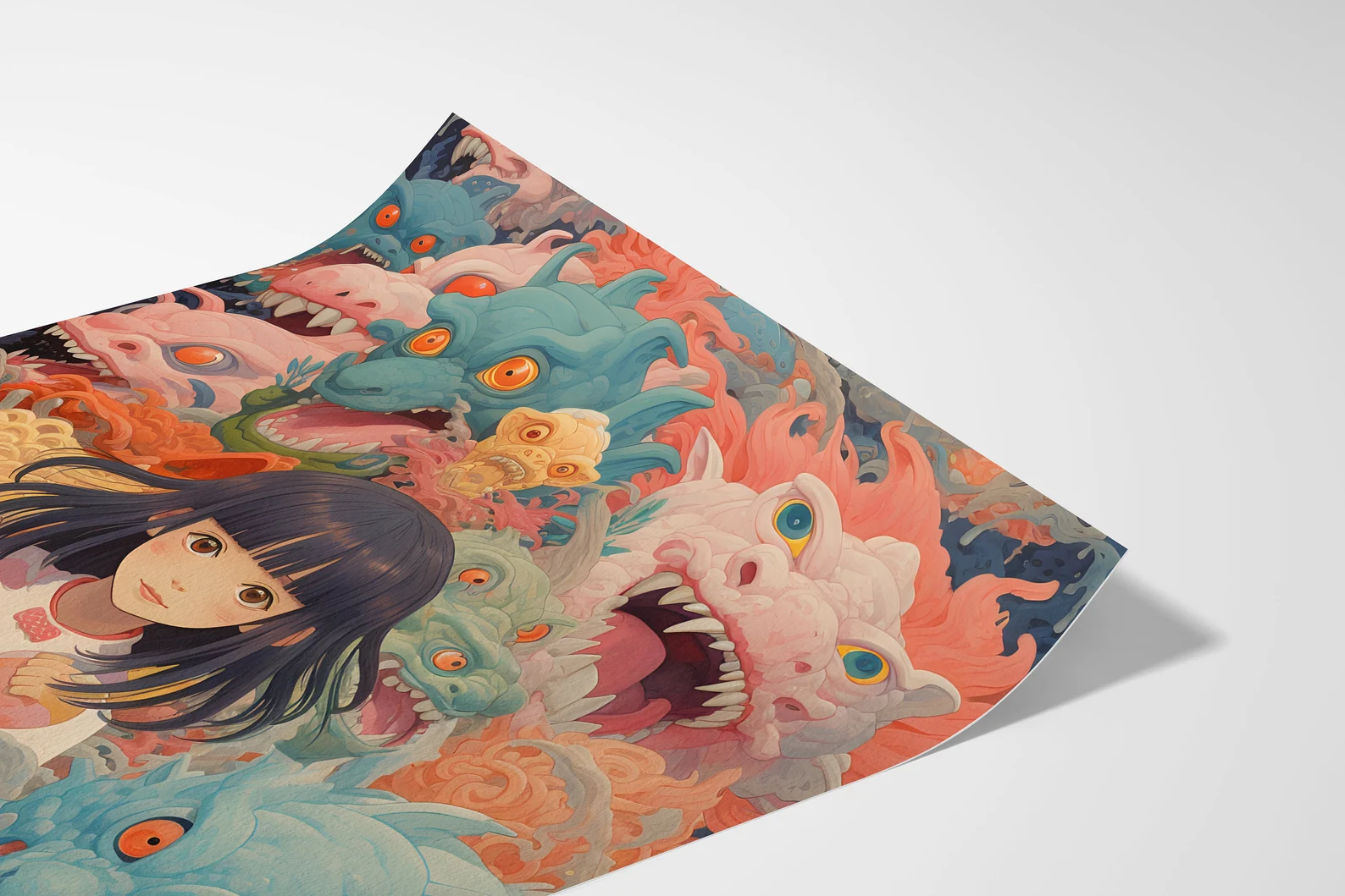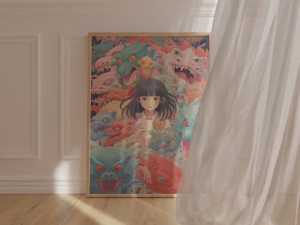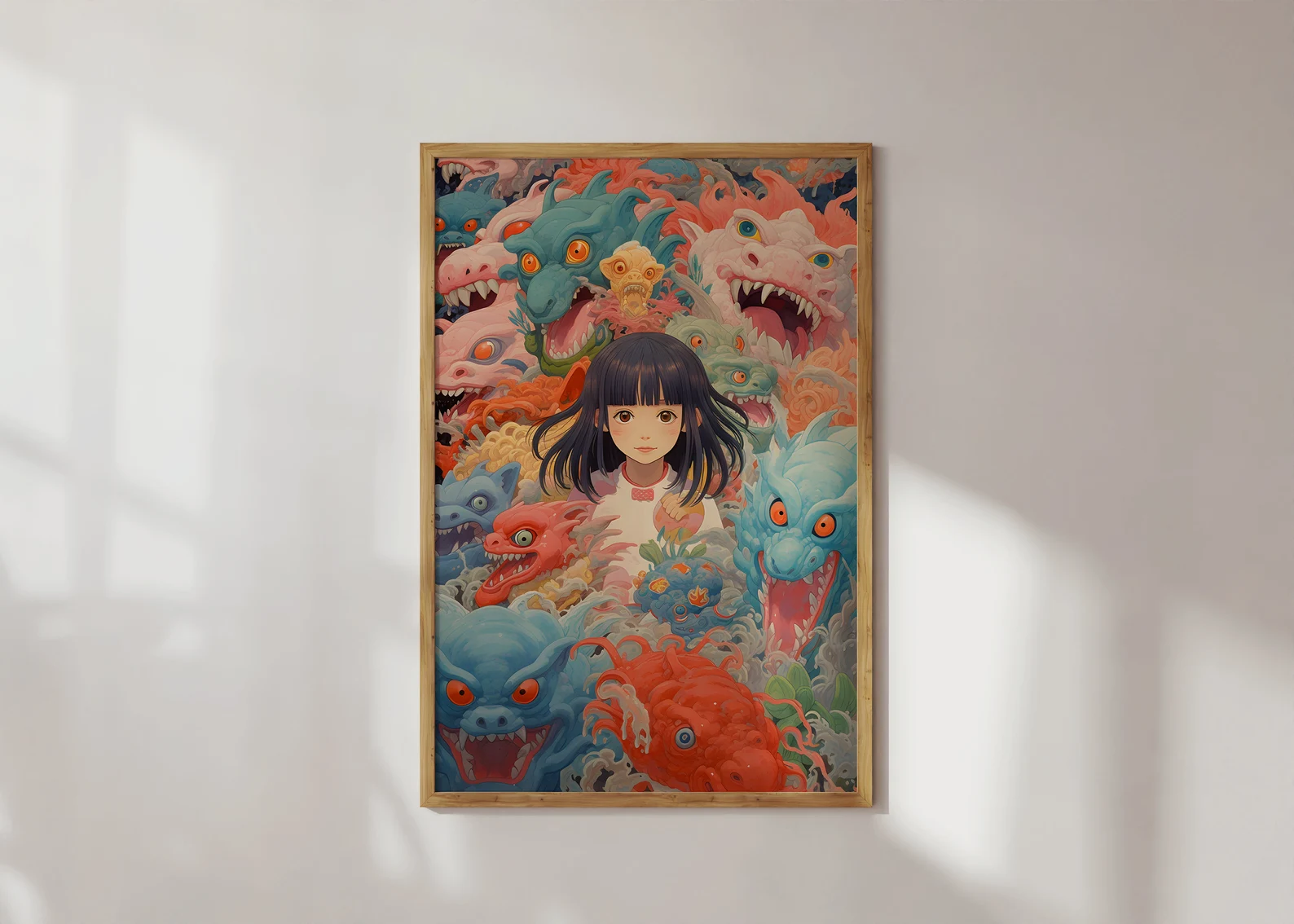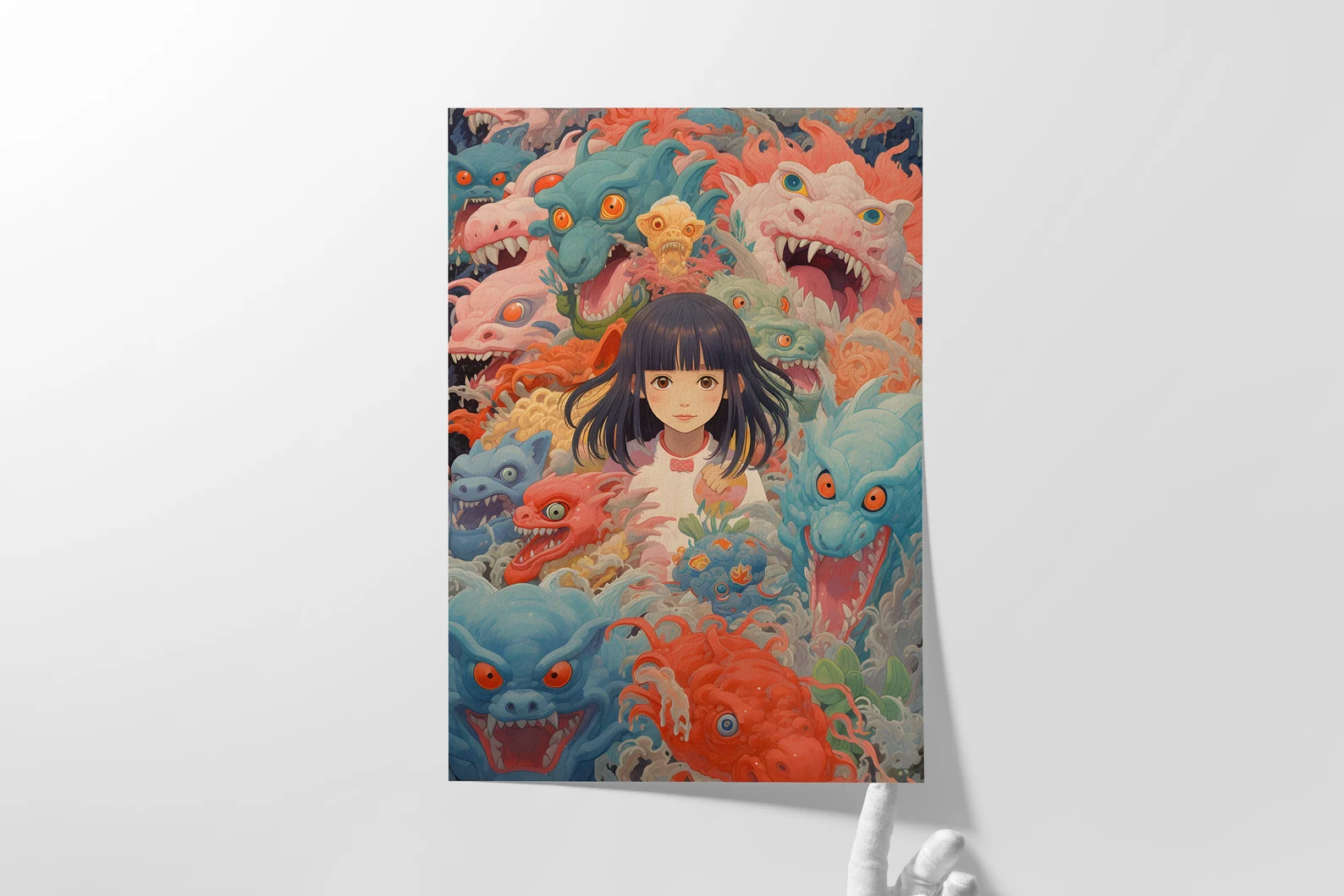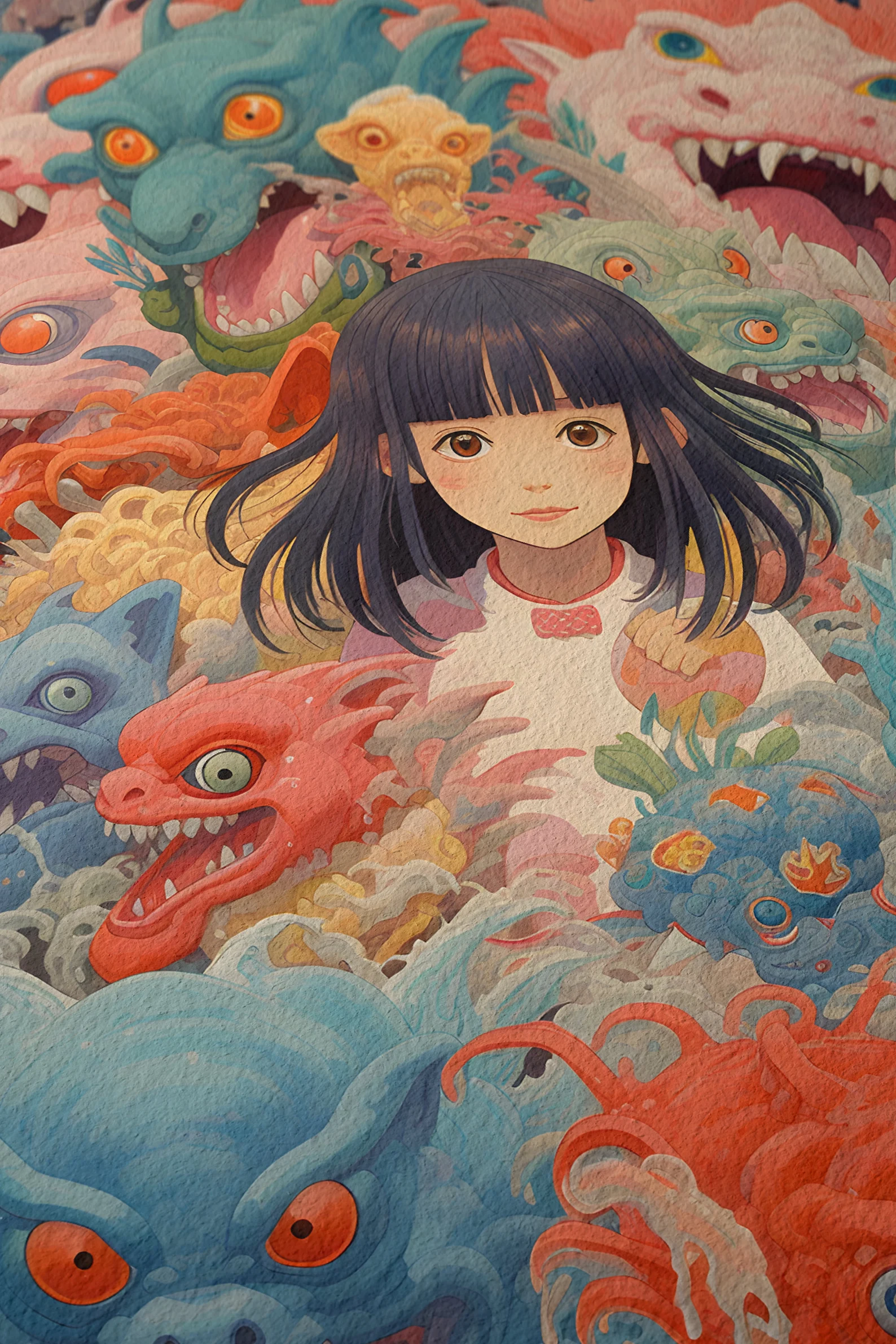 Welcome to the Group Chat is what happens when Studio Ghibli, a stress dream, and your inner child all get locked in a room together. The calm, wide-eyed girl at the center? She's you pretending to have it together. The wild, colorful creatures closing in? Also, you, but in group chat mode. This print is playful, layered, and weird in all the right ways, serving up just enough cuteness to disguise the existential chaos.