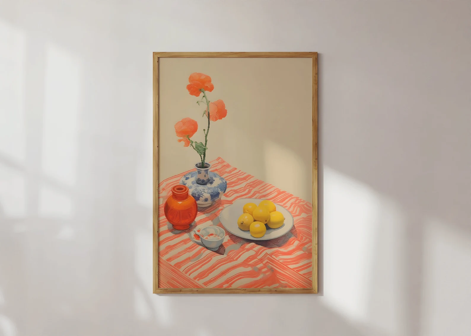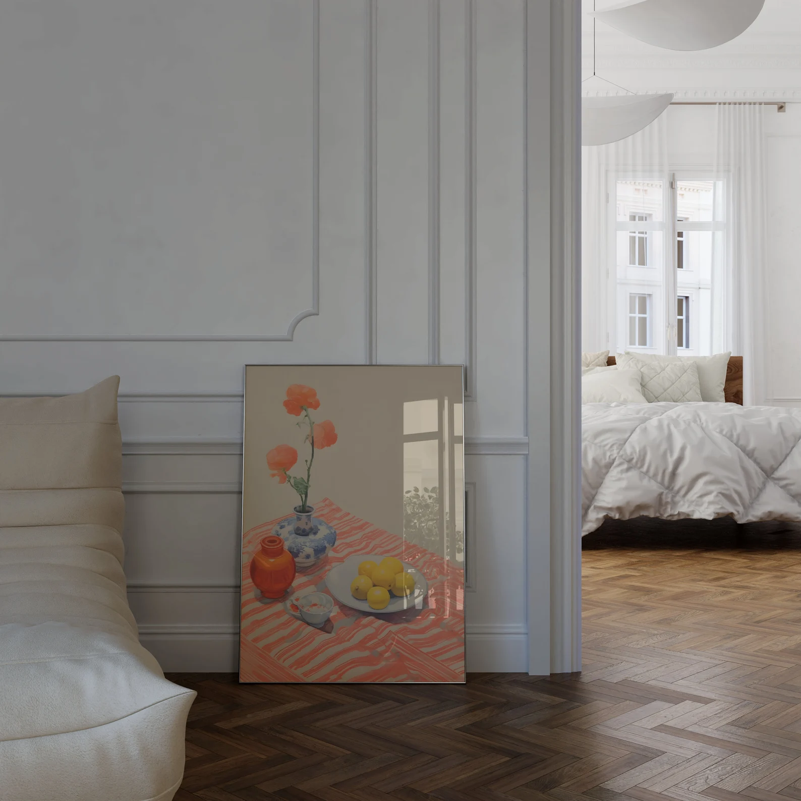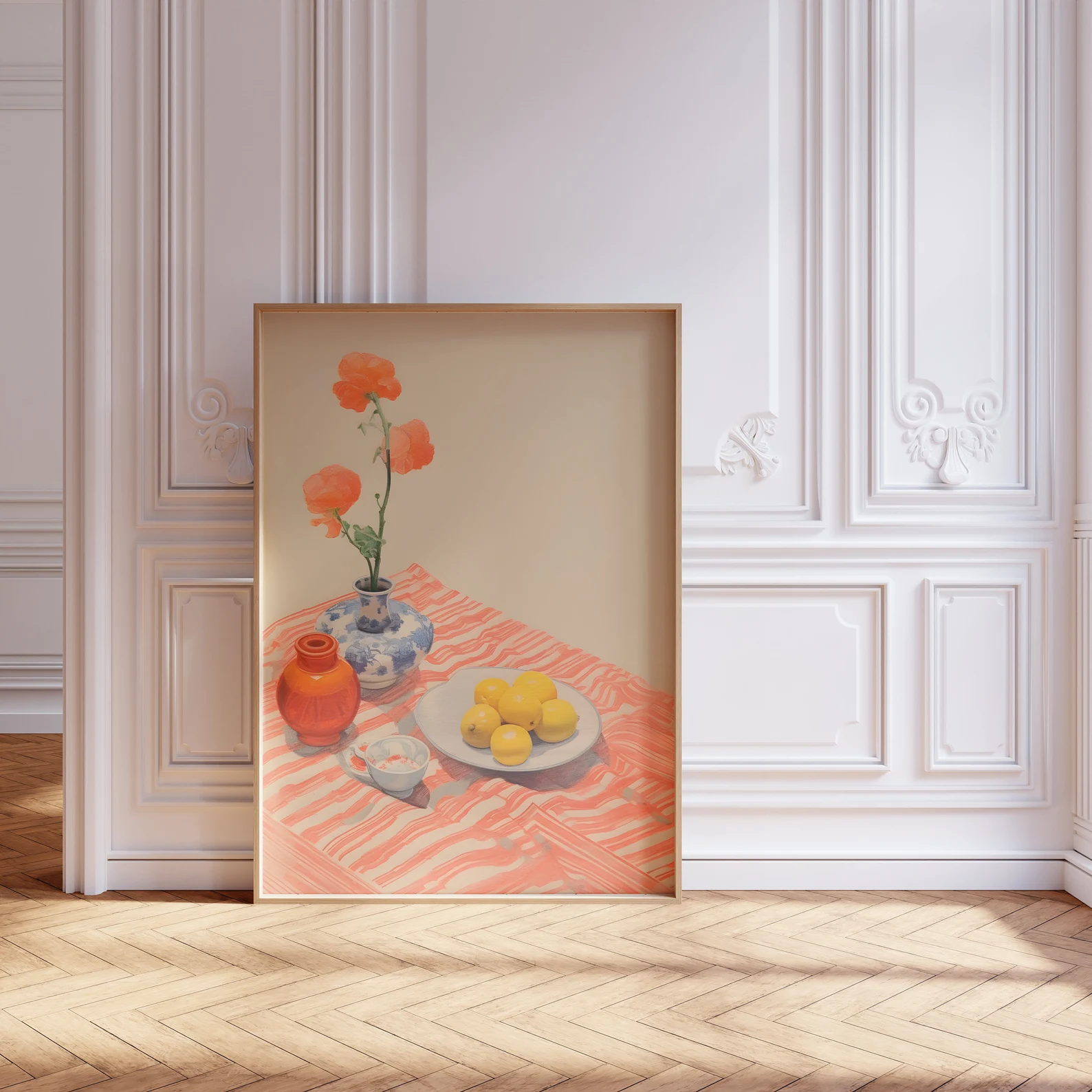 Think serene Sunday morning… if Sunday mornings were broadcast in full technicolor and your coffee decided to join the rave. This composition’s all soft petals and sharp citrus, an elegant rebellion of calm-meets-chaos. Every detail’s been lovingly styled (yes, even that striped tablecloth), resulting in a print that feels like an inside joke whispered between your walls. It’s polished but never boring, just like you.