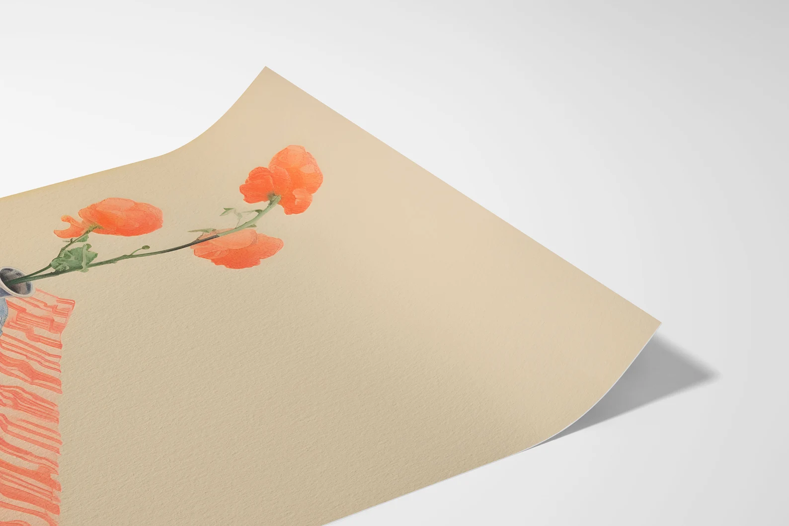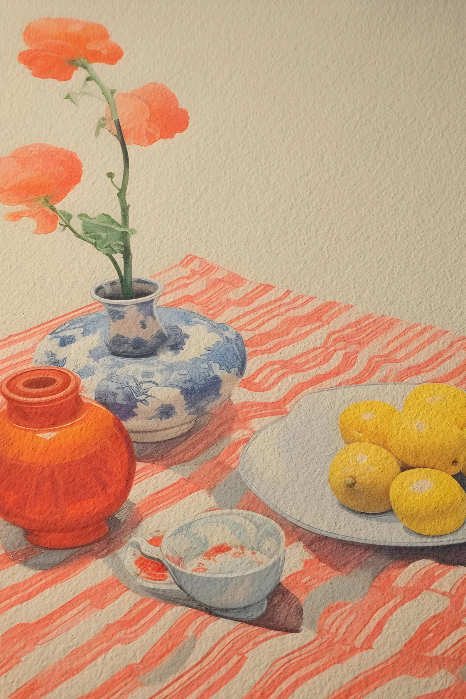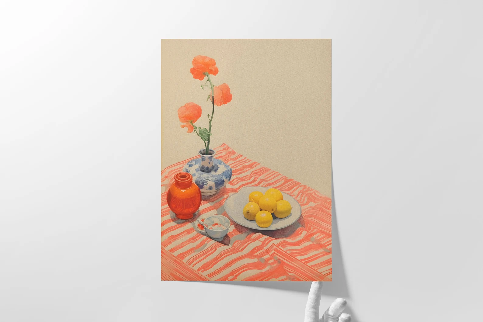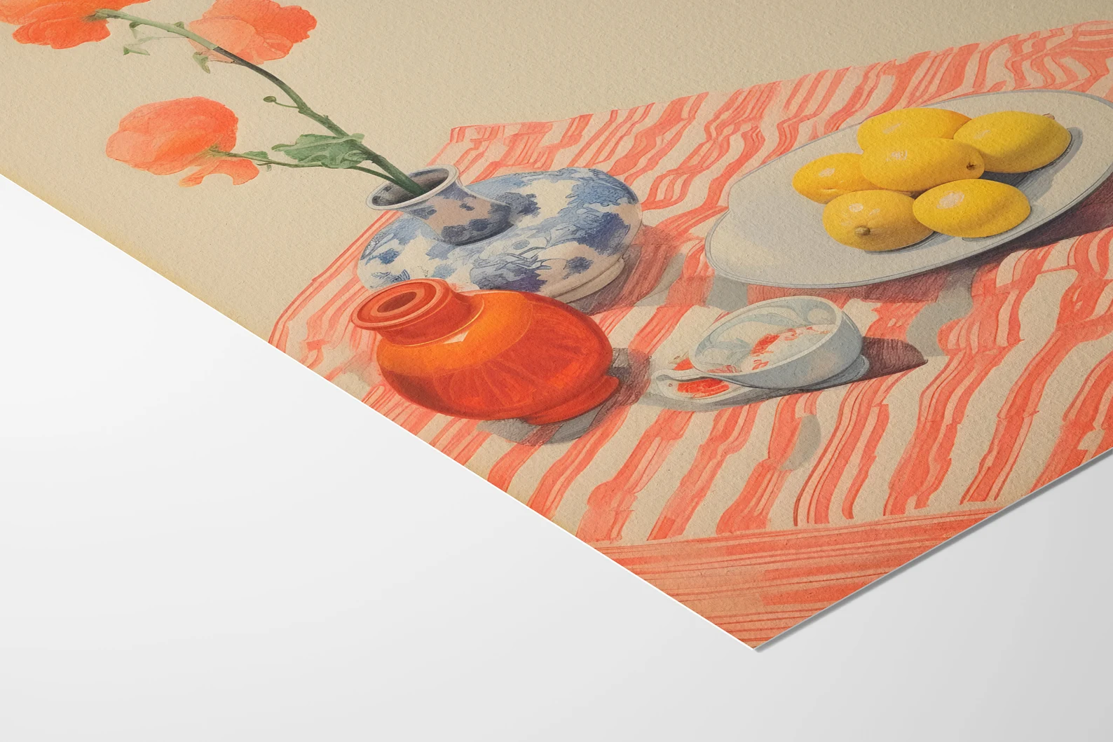 Think serene Sunday morning… if Sunday mornings were broadcast in full technicolor and your coffee decided to join the rave. This composition’s all soft petals and sharp citrus, an elegant rebellion of calm-meets-chaos. Every detail’s been lovingly styled (yes, even that striped tablecloth), resulting in a print that feels like an inside joke whispered between your walls. It’s polished but never boring, just like you.